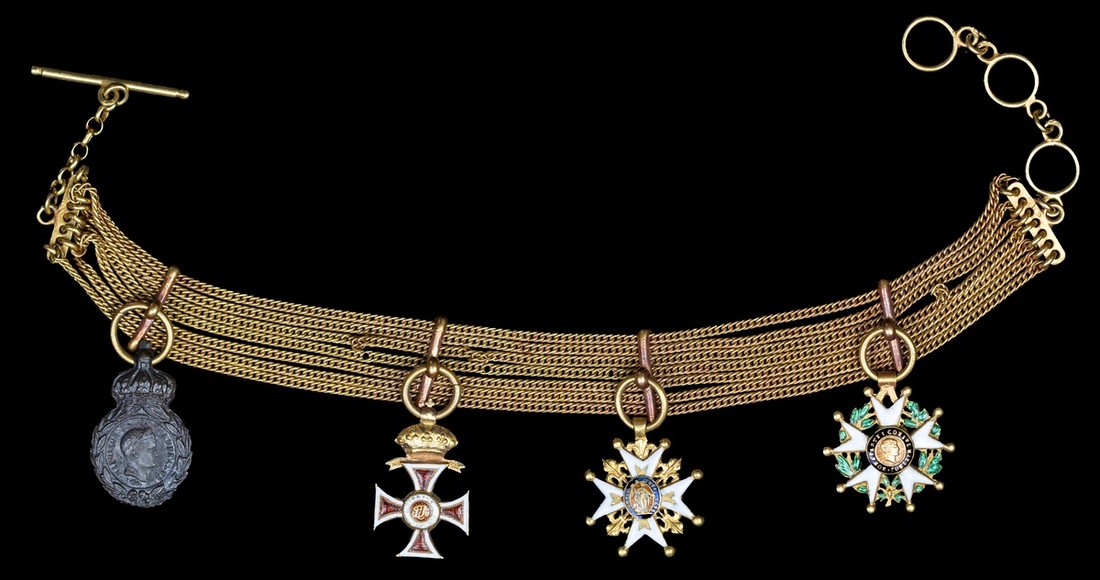 France, Legion of Honour, gilt and enamel; Royal and Military Order of St. Louis, gilt and enamel; Austria, Order of Leopold, gilt and enamel; France, St. Helena Medal, bronze, mounted continental-style as worn upon seven braided chains with loop and catch at either end, some wear to Order of St. Louis enamel, otherwise overall good very fine, housed in a H. Slingsby Ltd., Nuneaton case (4)