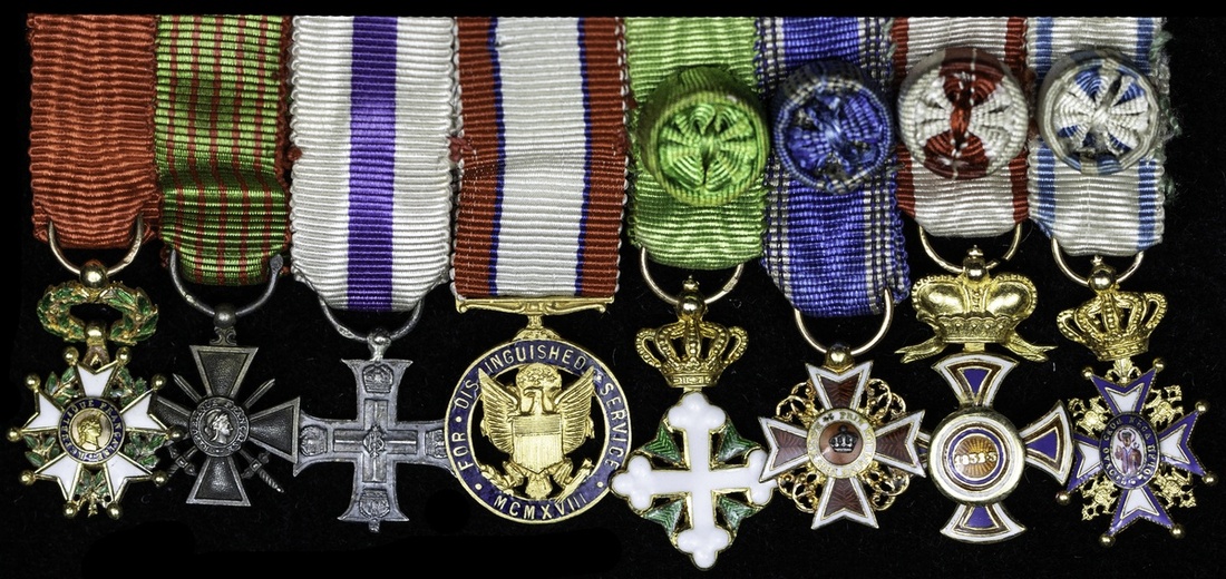 France, Republic, Legion of Honor; Croix de Guerre, reverse dated 1914-17; United Kingdom, Military Cross, hallmark to loop; United States of America, Distinguished Service Medal; Italy, Kingdom, Order of St. Maurice and St. Lazarus, hallmark to loop, with rosette on riband; Romania, Kingdom, Order of the Crown, with rosette on riband; Montenegro, Kingdom, Order of Danilo, with rosette on riband; Serbia, Kingdom, Order of St. Sava, with rosette on riband, mounted together as worn with two pins and a button by Kretly, 46 Palais Royal, Paris, in case of issue, Montenegro order missing central medallion to the reverse, otherwise good very fine overall (8)
