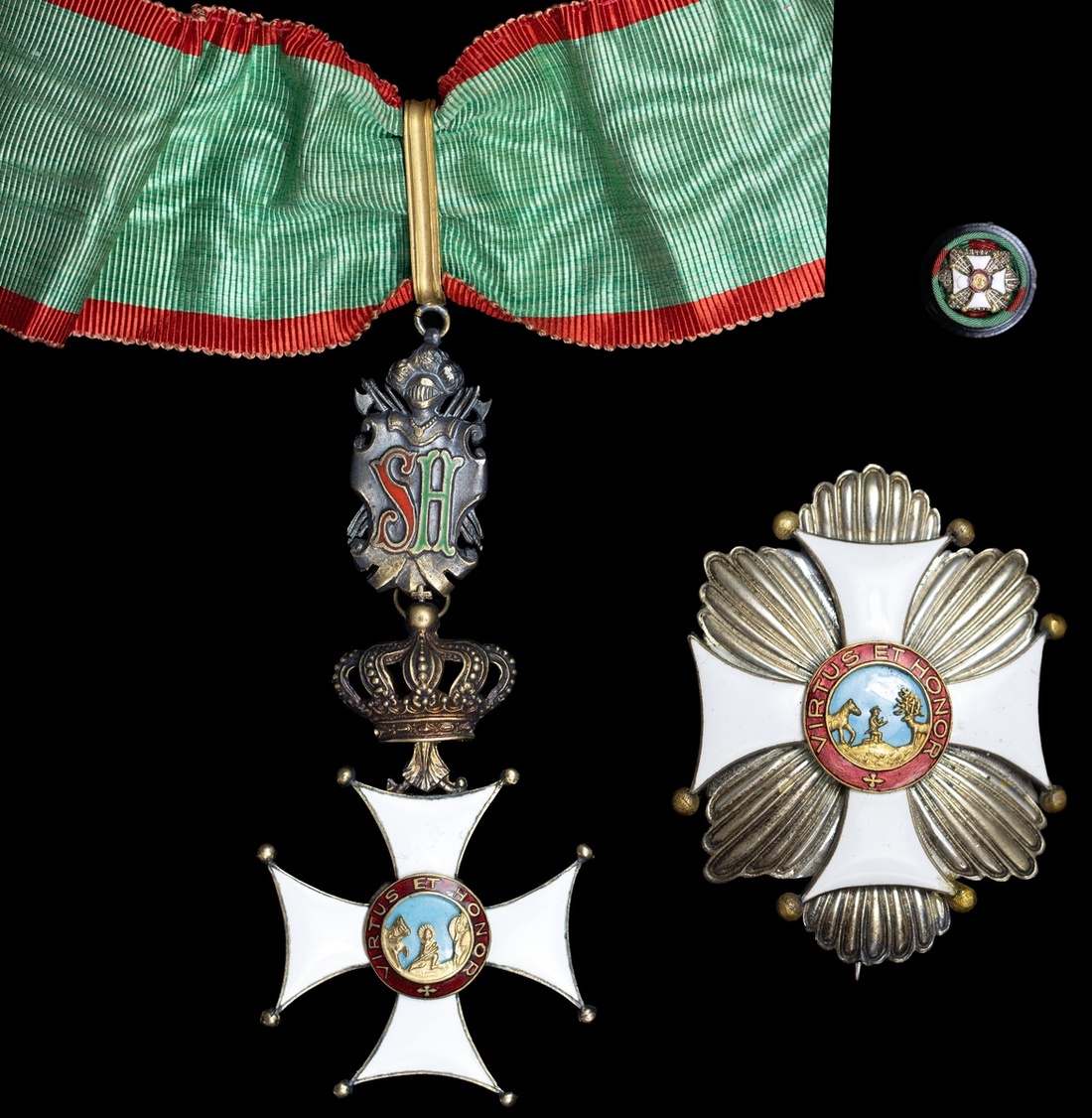 (x) Germany, Bavaria, Order of St. Hubertus de Lorraine et du Barrois (Order of Fidelity), set of Insignia by Arturo Pozzi, Galleria Colonnia 12, Roma, comprising breast Star, 67mm x 54mm, silver, silver-gilt and enamel, maker's cartouche to reverse; neck Badge, 102mm including ornate suspension x 47mm, silver, silver-gilt and enamel, on neck riband as worn, ball finial missing to one ray tip of Star, neck Badge centre slightly loose, otherwise very fine, in worn case with boutonniere (2)