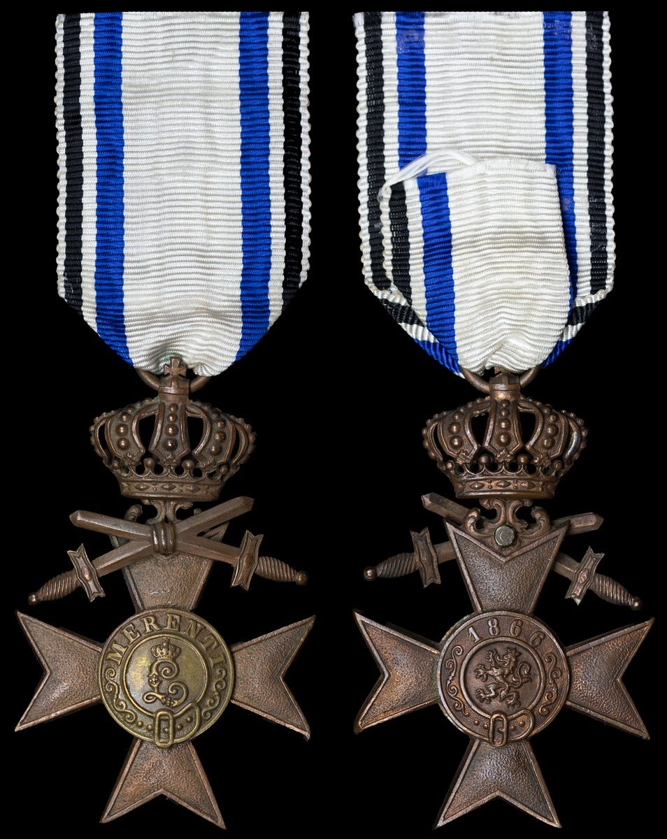 (x) Germany, Bavaria, Military Merit Order, 3rd Class breast Badge with Swords, by Gebrüder Hemmerle, 63mm including crown suspension x 41mm, bronze, Swords slightly loose and a couple ray tips slightly bent, otherwise very fine, in its worn fitted case of issue