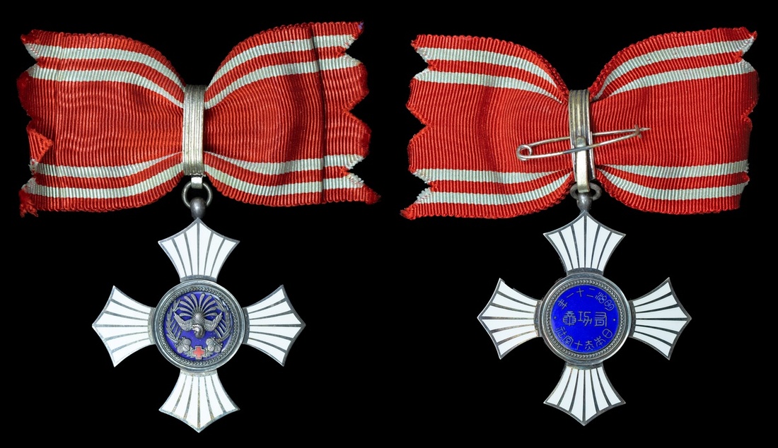 (x) Japan, Empire, Red Cross Order of Merit, ladies shoulder Badge, 46mm, silver and enamel, good very fine, in fitted case of issue, this with broken hinge