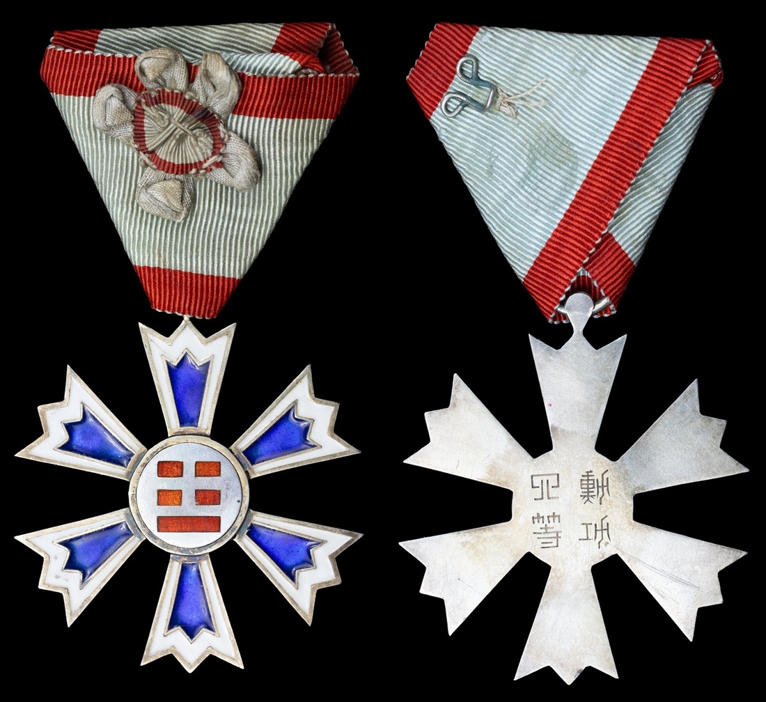 (x) Korea, Empire, Order of the Eight Trigrams, 4th Class breast Badge, with flower rosette on detached riband, 51mm, silver and enamel, silver hallmark to ring, local characters to reverse, light wear to enamel with scratch to upper ray, otherwise very fine