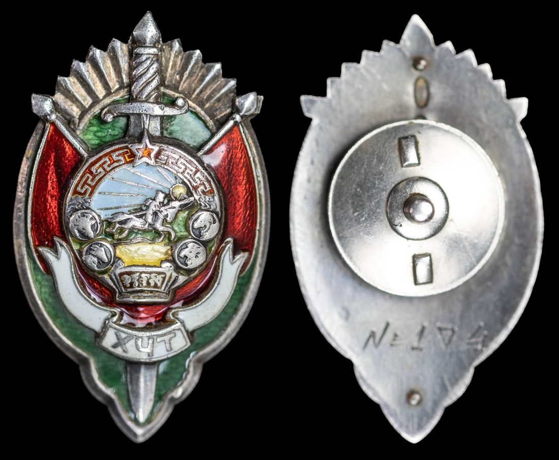 (x) Mongolia, Soviet Peoples' Republic, Officer's State Security Badge, reverse numbered '104', 44mm x 26mm, silver and enamel, with hallmarks and silver marks to reverse, screw plate backing, good very fine