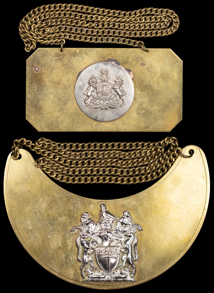 Rhodesia, Rhodesian Native Chief's Badge and Gorget, brass, each pierced and on neck chain for wear, some toning, very fine (2)