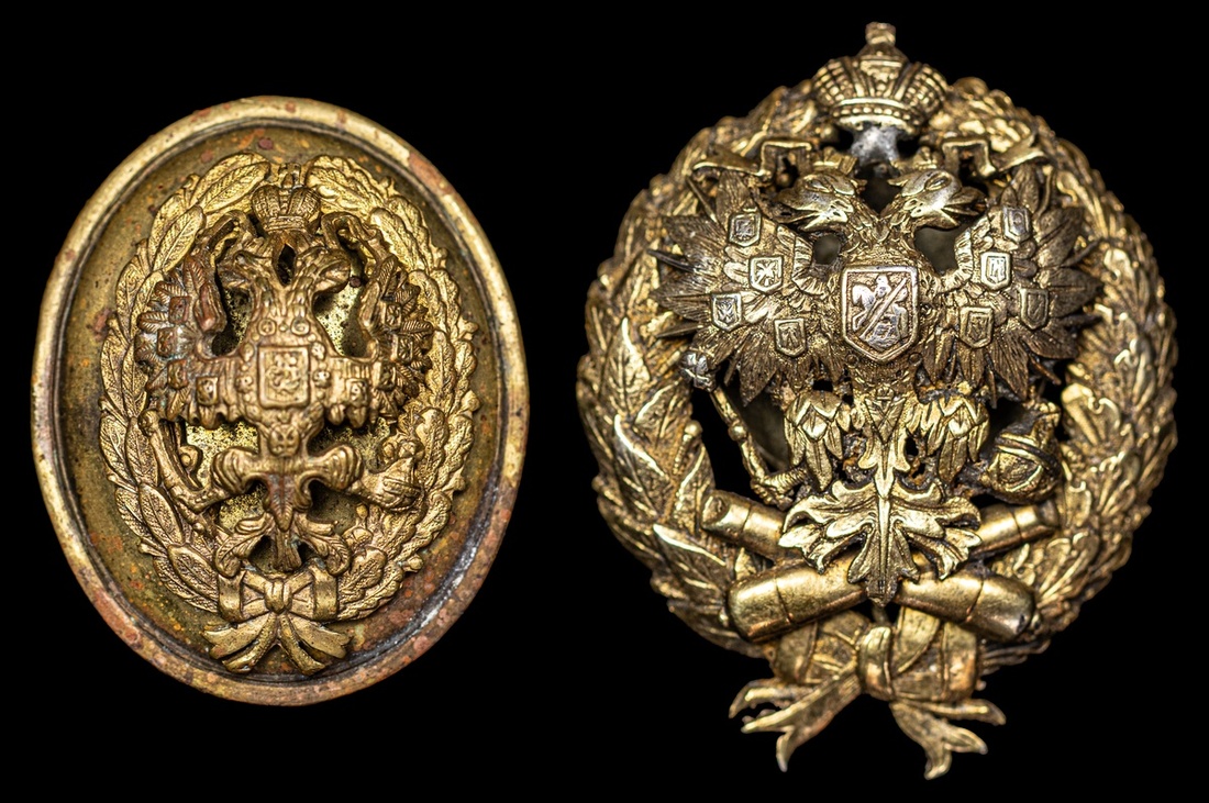 Russia, Imperial, Graduation Badge for Michael’s Artillery Academy – Mikhailovskaya Artillery Academy in St Petersburg, gilt metal, 5.7cm x 4.5cm, screw fitting to reverse, small solder repair at 12 o'clock, otherwise very fine; together with another Imperial Badge with eagle within wreath, bronze gilt, 4.6cm x 3.6cm, screw fitting to reverse, some staining and tarnishing, otherwise very fine (2)