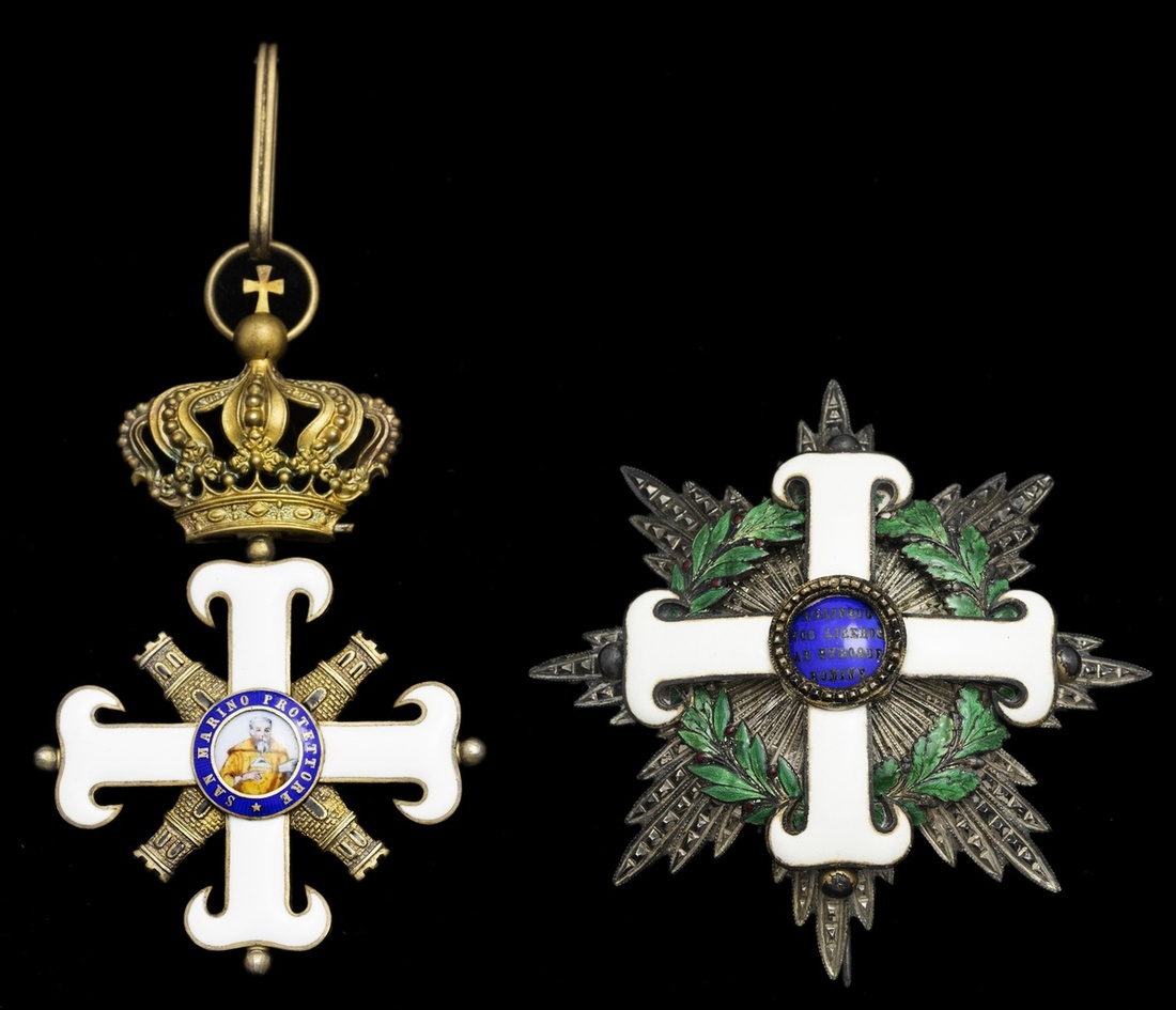 (x) San Marino, Republic, Order of San Marino, breast Star, by E. Gardino Succ. Cravanzola, Rome, 76mm, silver and enamel; neck Badge, 90mm including crown suspension x 56mm, gilt and enamel, good very fine and better (2)