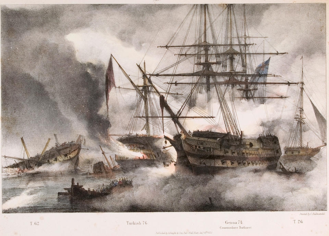The Battle of Navarino was fought on 20 October 1827 during the Greek War of Independence (1821-29). A combined Turkish and Egyptian armada under Tahir Pasha was destroyed by Admiral Sir Edward Codrington's allied British, French, and Russian naval force at the port of Navarino (now Pylos), in southern Greece. The Allied ships were better armed than their Egyptian and Turkish enemies and their crews better trained, resulting in a quick victory despite being vastly outnumbered.