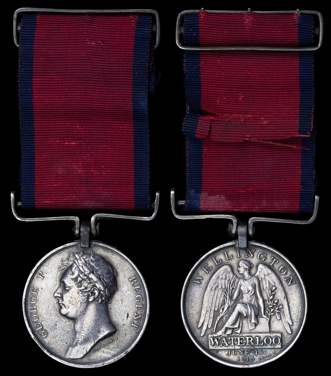 Waterloo 1815 (Thomas Taylor. 1st Regiment Life Guards.), first three letters of name officially re-impressed, original steel clip with contemporary silver straight-bar suspension, mounted upon its original riband bearing a contemporary three-pronged silver buckle, very fine