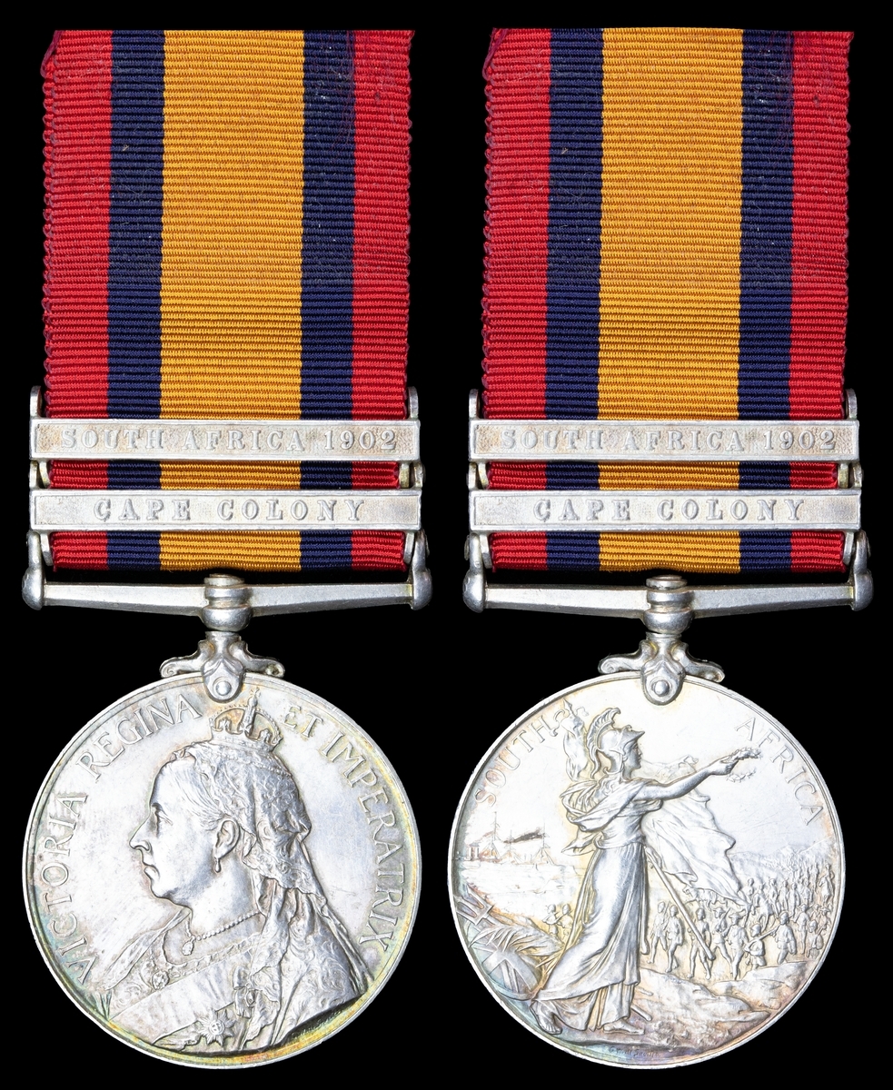 Queen's South Africa 1899-1902, 2 clasps, Cape Colony, South Africa 1902 (41096 Pte M. Carrick. 139th Coy Imp: Yeo:), pawnbrokers mark to the obverse, otherwise very fine