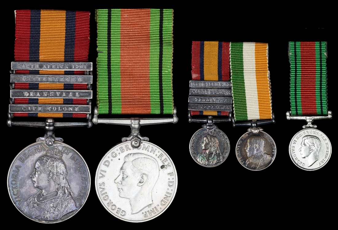 Sold together with a contemporary miniature Queen's South Africa Medal, silver, clasps corresponding to the full-size award, and a King's South Africa Medal, silver, mounted together as a pair (there is no evidence Anderson was entitled to the latter); also an unrelated Defence Medal 1939-45 and corresponding miniature, both mounted for wear.