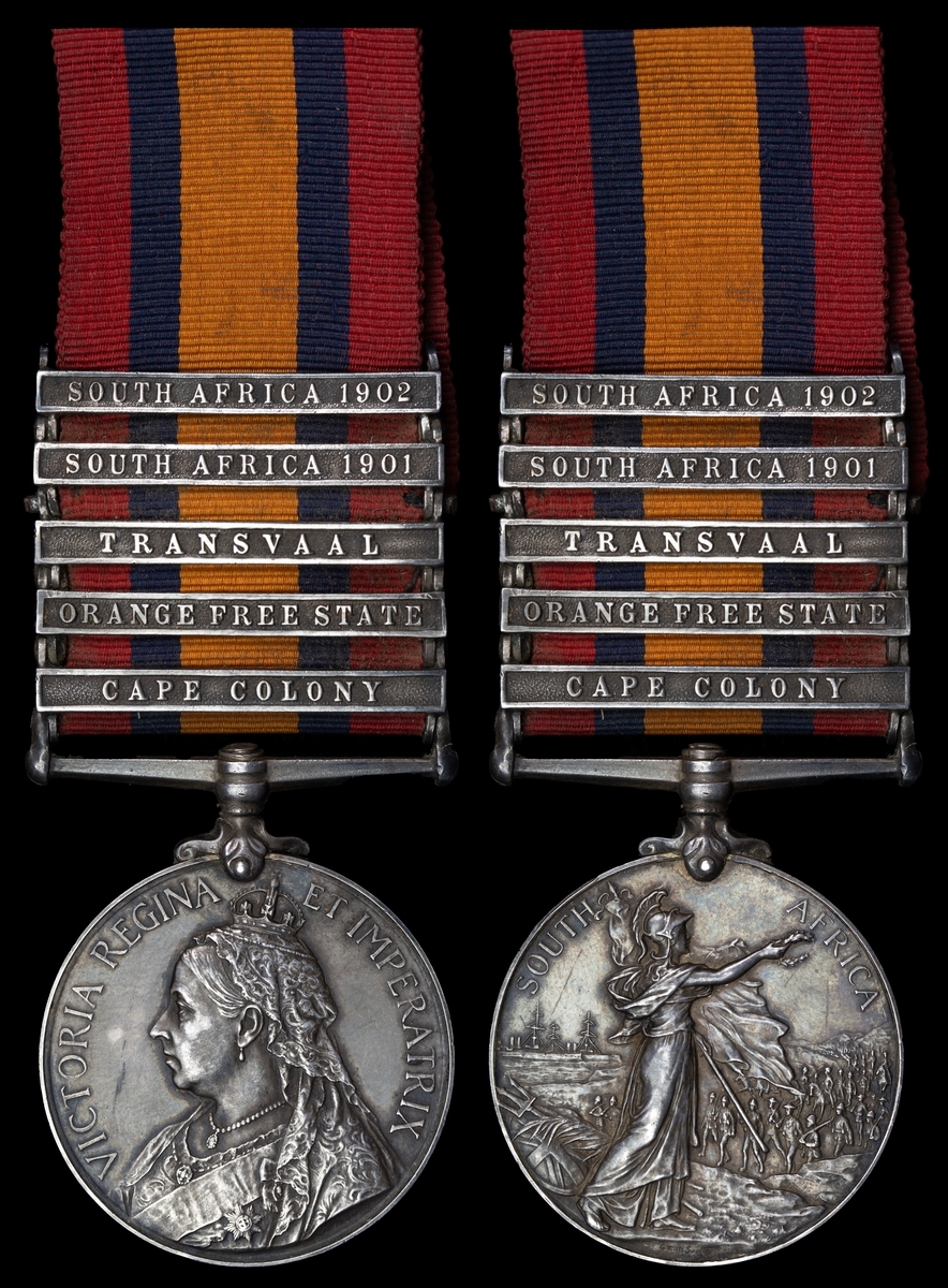 Queen's South Africa 1899-1902, 5 clasps, Cape Colony, Orange Free State, Transvaal, South Africa 1901, South Africa 1902 (20428 Pte W. Cook. 2nd Coy Imp: Yeo:), the last two clasps fitted to the Transvaal clasp with a riband roller and not rivetts, lightly toned, good very fine (2)