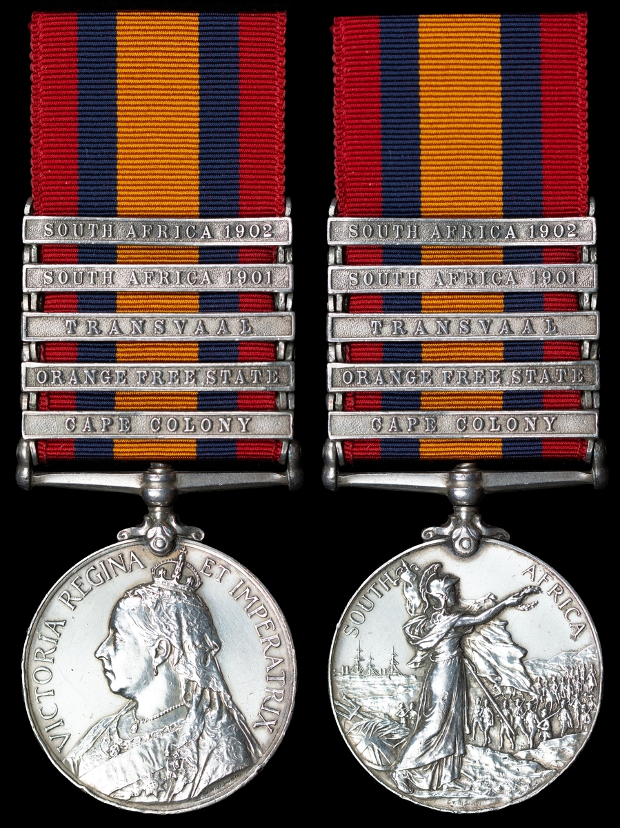 Queen's South Africa 1899-1902, 5 clasps, Cape Colony Orange Free State, Transvaal, South Africa 1901, South Africa 1902 (6291 Pte. W. A. Holding. Shrops: L.I.), unofficial rivetts between 3rd and 4th clasps, heavy edge bruising, contact marks, nearly very fine