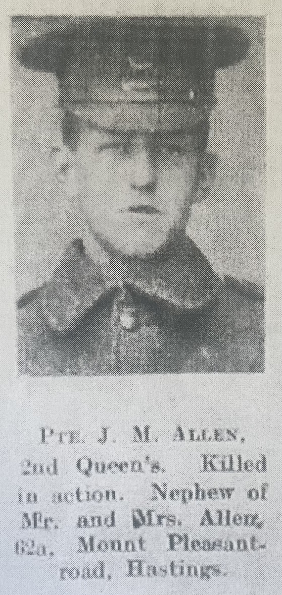 James Morgan Allen was born in 1896 at Borough, Southwark and enlisted into The Queen's Regiment in February 1915. He served in France with the 2nd Battalion from 1 June 1915 and was killed in action on 1 July 1916. On the First Day of the Battle of the Somme, the unit were part of 7th Division and attacked near Mametz, he is commemorated upon the Thiepval Memorial; sold together with a newspaper extract which includes his portrait.