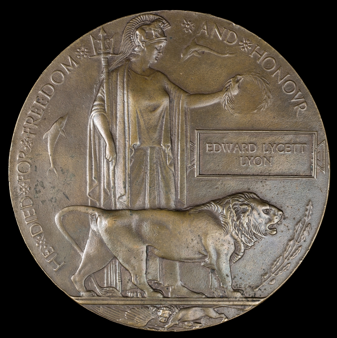 Great War Bronze Memorial Plaque (Edward Lycett Lyon), previously mounted for display, adhesive label affixed to reverse, about very fine