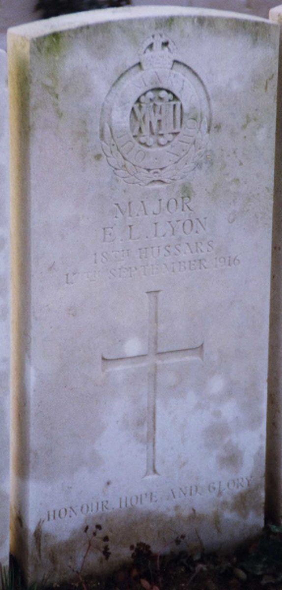 Edward Lycett Lyon, son of Edward Lyon of 15 Rue Las Casas, Paris, was born on 30 January 1877 at Boston, Massachusetts, U.S.A., and was educated at Harrow School (1892-96) before going up to Trinity College, Cambridge. Attending the Royal Military College Sandhurst, Gentleman Cadet Lyon was commissioned Second Lieutenant in the 18th (Queen Mary's Own) Hussars on 23 May 1900 (London Gazette, 22 May 1900 refers). Swiftly sent out to South Africa to join his regiment (Queen's and King's medals with clasps) and promoted Lieutenant in 1901, his next service abroad was as Aide-de-Camp to the Governor and Commander-in-Chief New Zealand (William Plunket, 5th Baron Plunket - incidentally another Old Harrovian) from 1907-09.