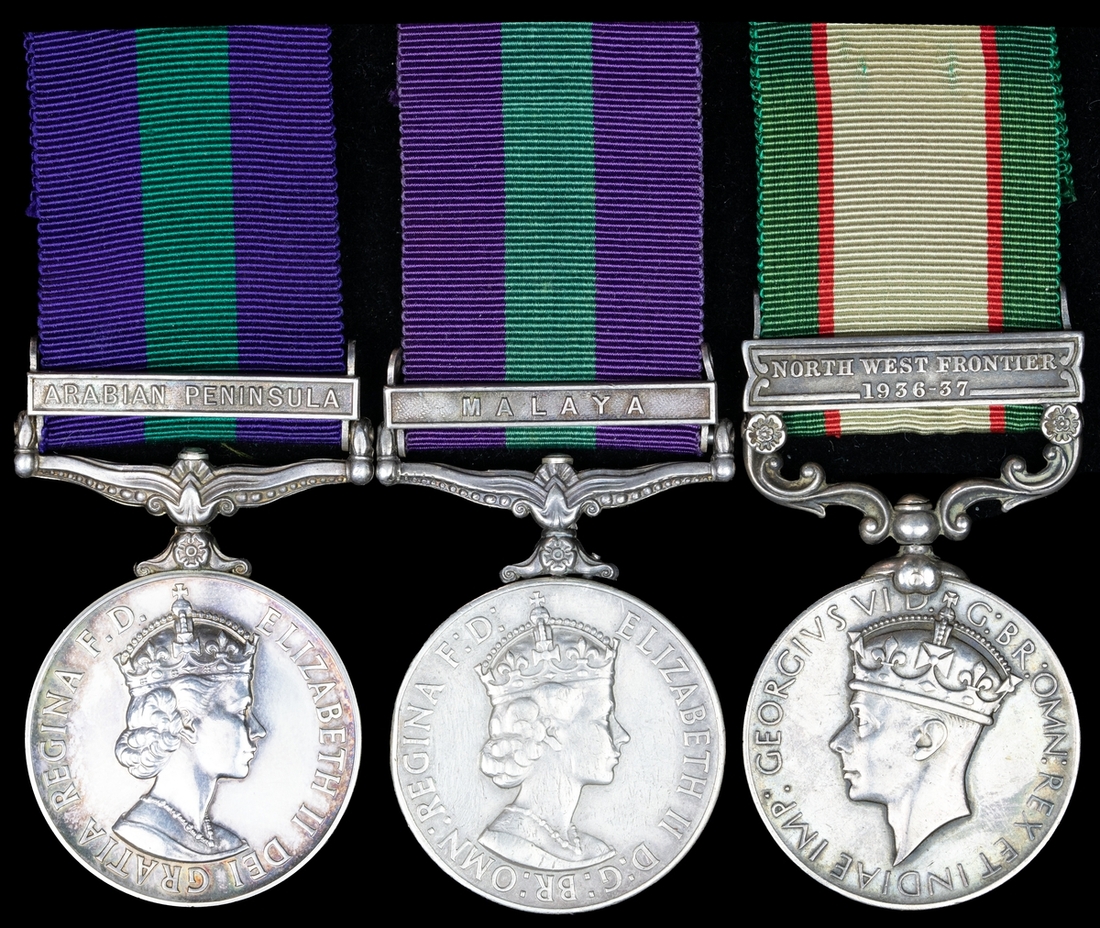 General Service 1918-62, 1 clasp, Malaya (EA18125190 Pte. Waiti Penswo N.R.R.), contact marks good fine; 1 clasp, Arabian Peninsula (2167 Pte. Hamad Matar. T.O.S.), very fine. India General Service 1936-39, 1 clasp, North West Frontier 1936-37 (7356 Sepoy Ziarat Gul, Tochi Scouts), very fine (3)
