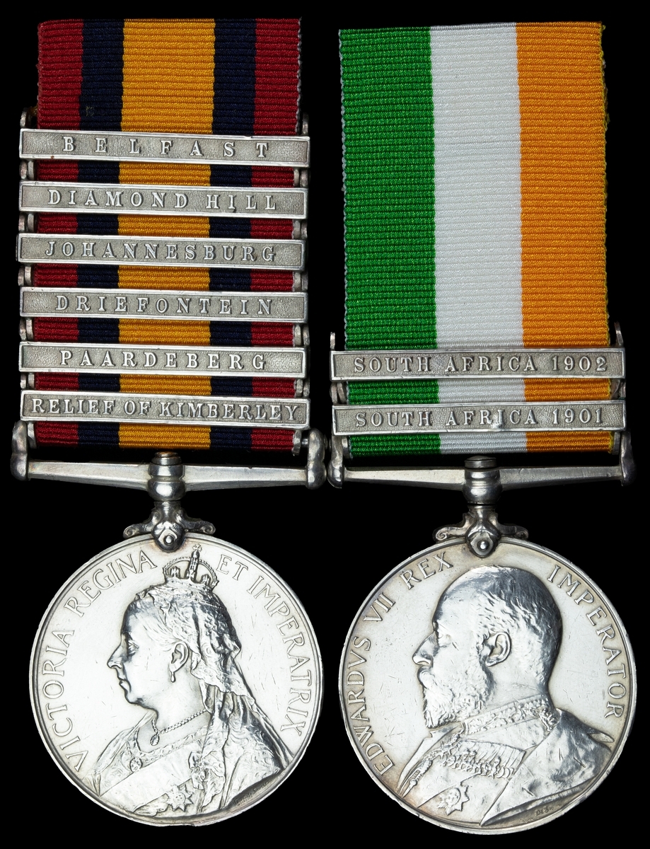 Queen's South Africa 1899-1902, 6 clasps, Relief of Kimberley, Paardeberg, Driefontein, Johannesburg, Diamond Hill, Belfast (4790 Pte. H. Chandler, York: Regt); King's South Africa 1901-1902, 2 clasps, South Africa 1901, South Africa 1902 (4790 Pte. H. Chandler. York. Regt), edge bruise and light contact marks, very fine (2)