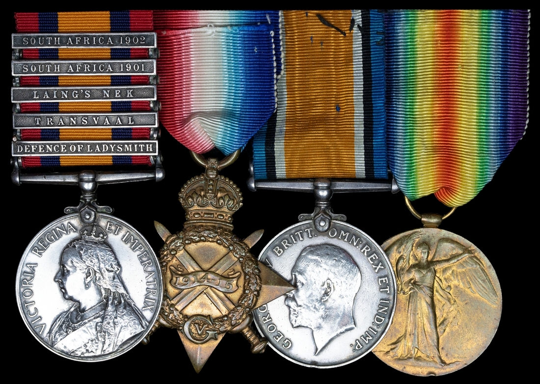 A Boer War and Great War group of four awarded to Driver J. P. Higgins, Royal Canadian Field Artillery, late Liverpool Regiment who was severely wounded at the action on Geluk Farm on 23 August 1900 where Private W. Heaton won his Victoria Cross: Higgins was to be invalided out on 1 March 1901