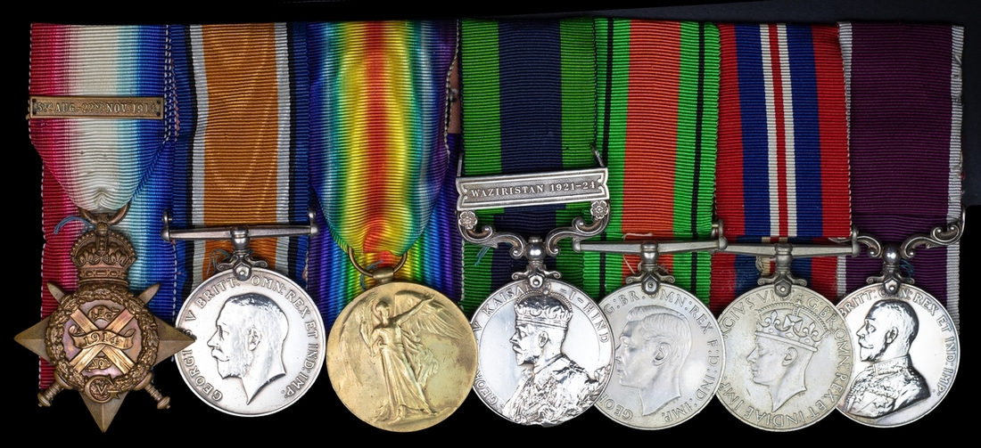1914 Star, with clasp (10140 Pte B. Pratt. R.Ir:Regt.); British War and Victory Medals (10140 A.W.O. Cl. 2. B. C. Pratt. R.Ir.Regt.); India General Service 1908-1935, 1 clasp, Waziristan 1921-24 (7109233 C.Sjt. B. C. Pratt. R. W. Fus.); Defence and War Medals 1939-45; Army L.S. & G.C., G.V.R. (7109233 W. O. Cl.II. B. C. Pratt. R. W. Fus.), pitting, light contact marks, minor polishing, overall very fine (7)