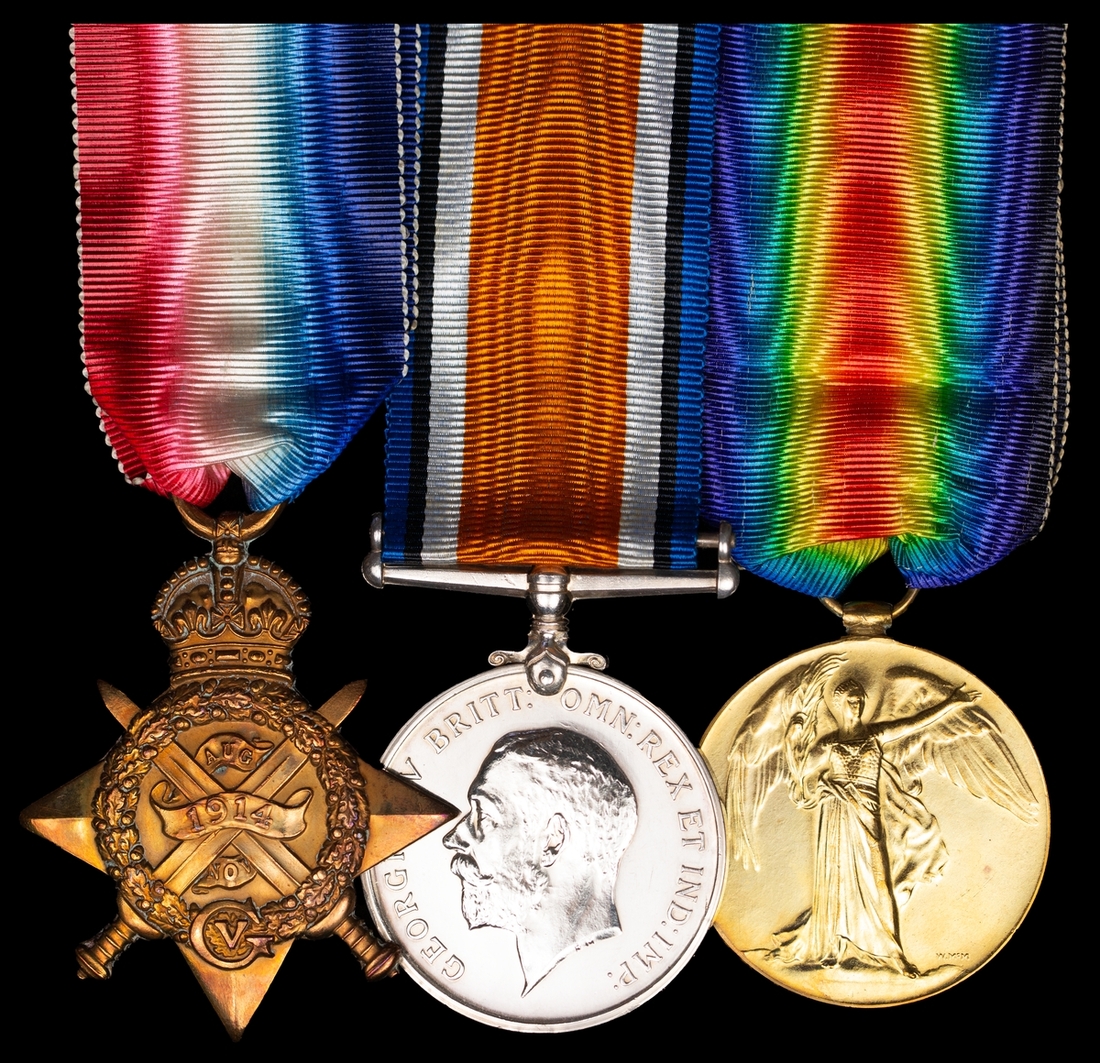 The Great War group of three awarded to Private J. Kirby, Shropshire Light Infantry, who was Killed in Action in France on 23 October 1914