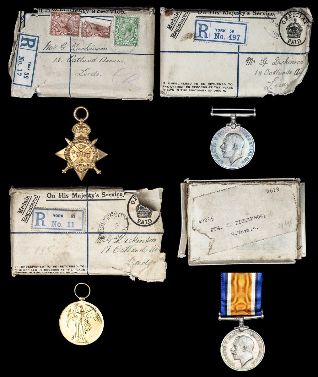 1914 Star (10289. Pte. G. Dickinson. 2/W.Rid:R.); British War and Victory Medals (3-10289 Pte. G. Dickinson. W. Rid.R.), in their box and envelopes of issue and accompanying medal issue slips for the BWM & VM and letter from the record office sending the 1914 star, extremely fine (3)
