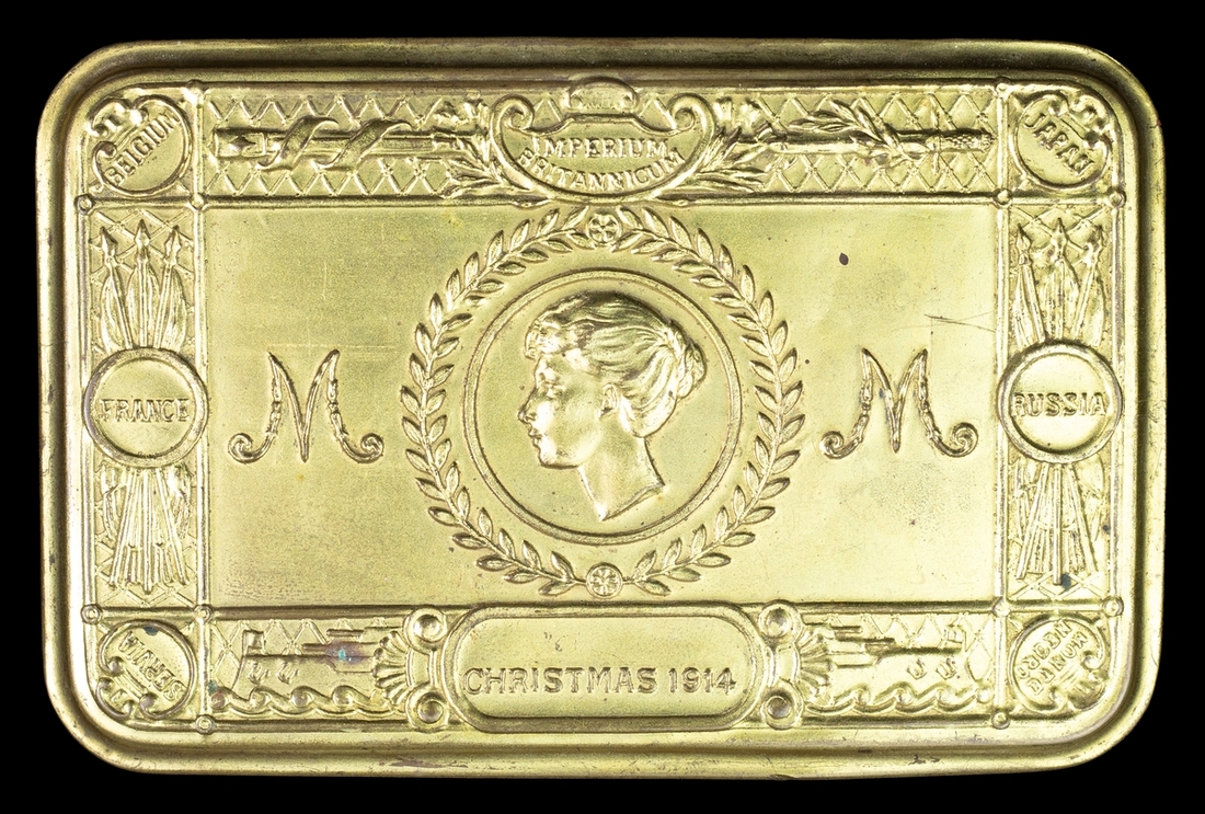 Sold together with treasure trove of original letters from George Dickinson to his family, mainly his mother, and letters from the family to George from his enlistment in 1913 until his death together with a letter from the War Office dated 6th September 1915 officially notifying the family of his death, silk labels commemorating the brothers, George's soldiers' small book and Princess Mary's Christmas tin for 1914.