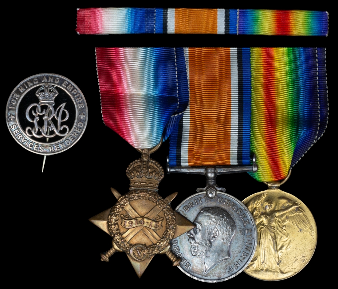 1914-15 Star (G-5696 Pte. G. W. Warner. The Queen's R.); British War and Victory Medals (G-5696 Pte. G. W. Warner. The Queen's R.); Silver War Badge (B157927), all with long lengths of original silk riband, good very fine (4)