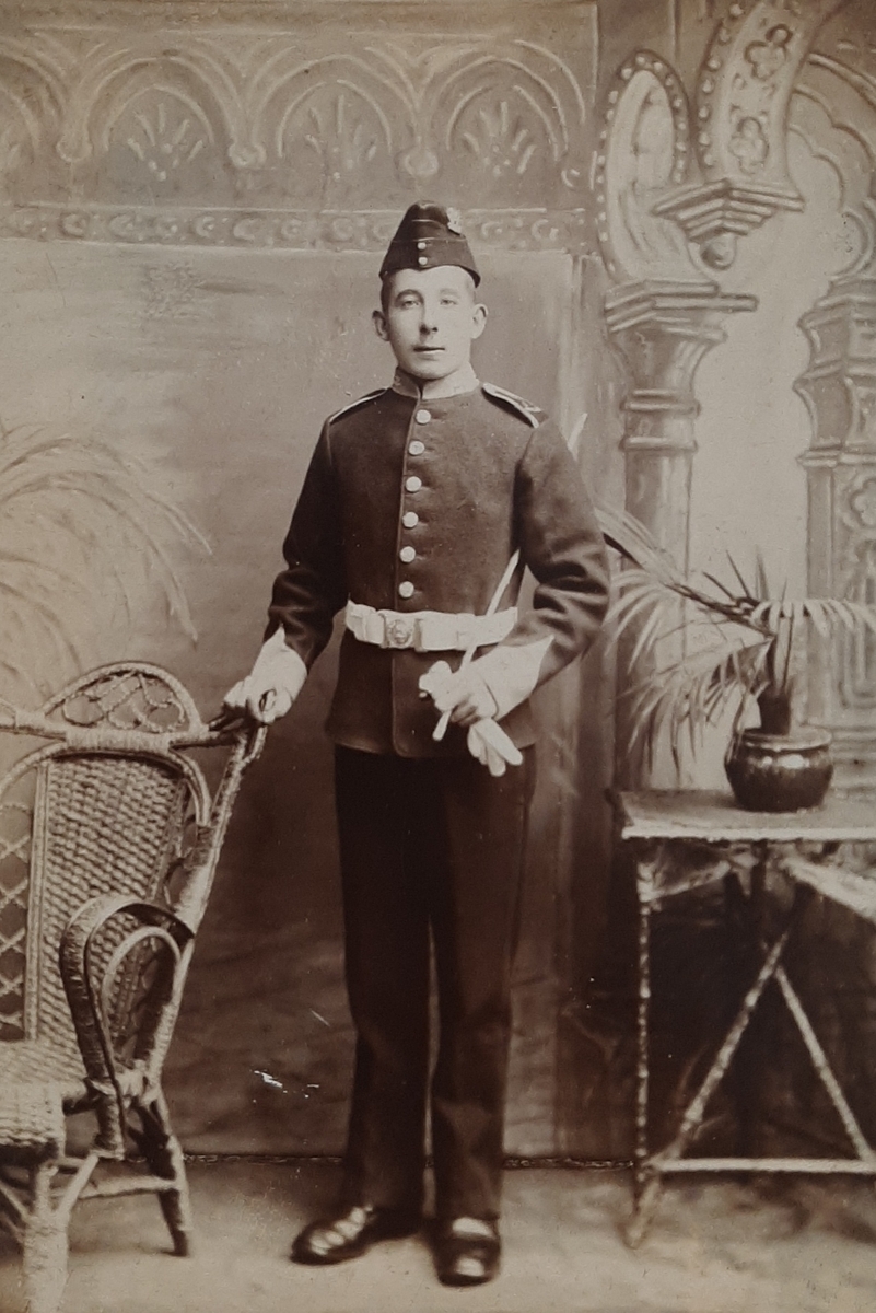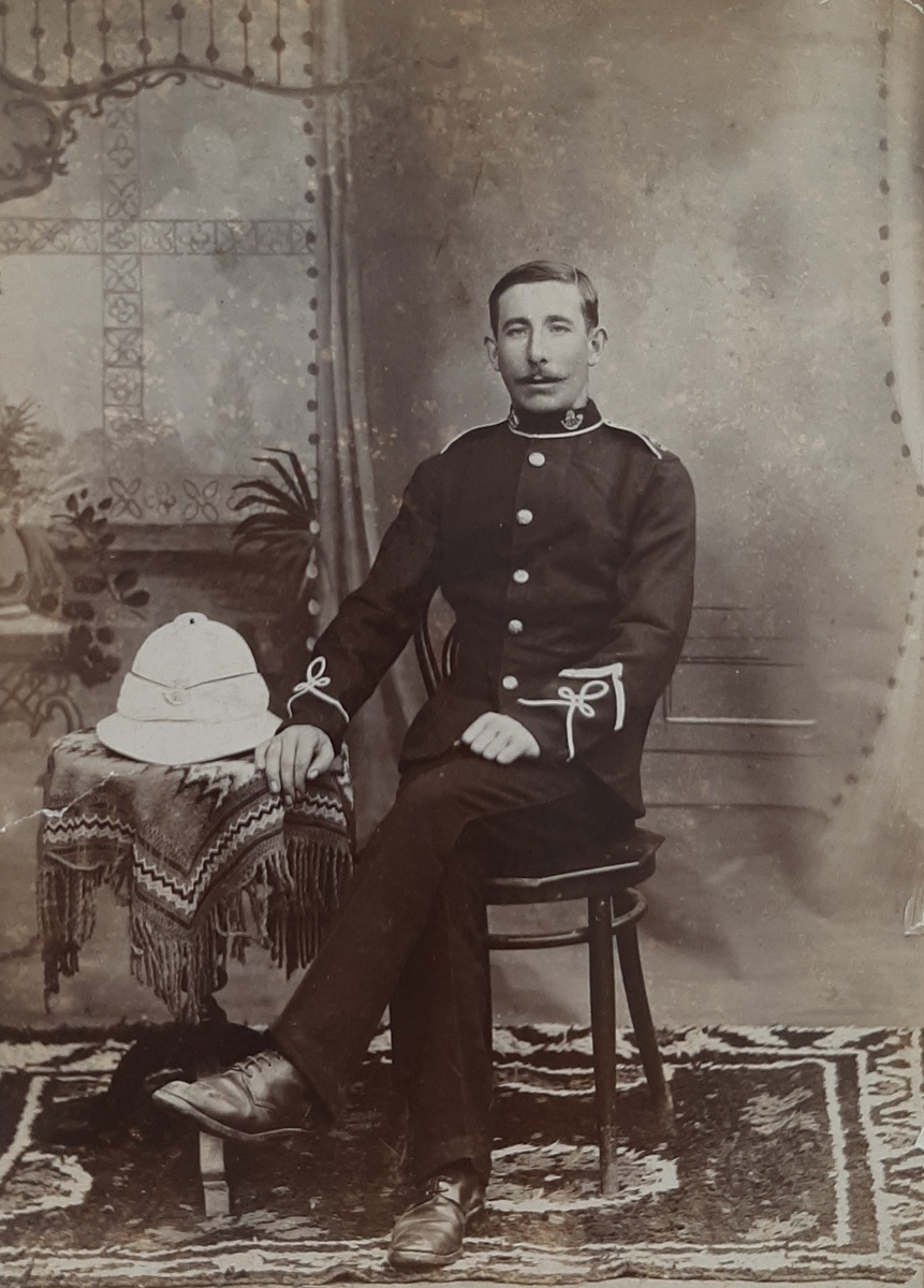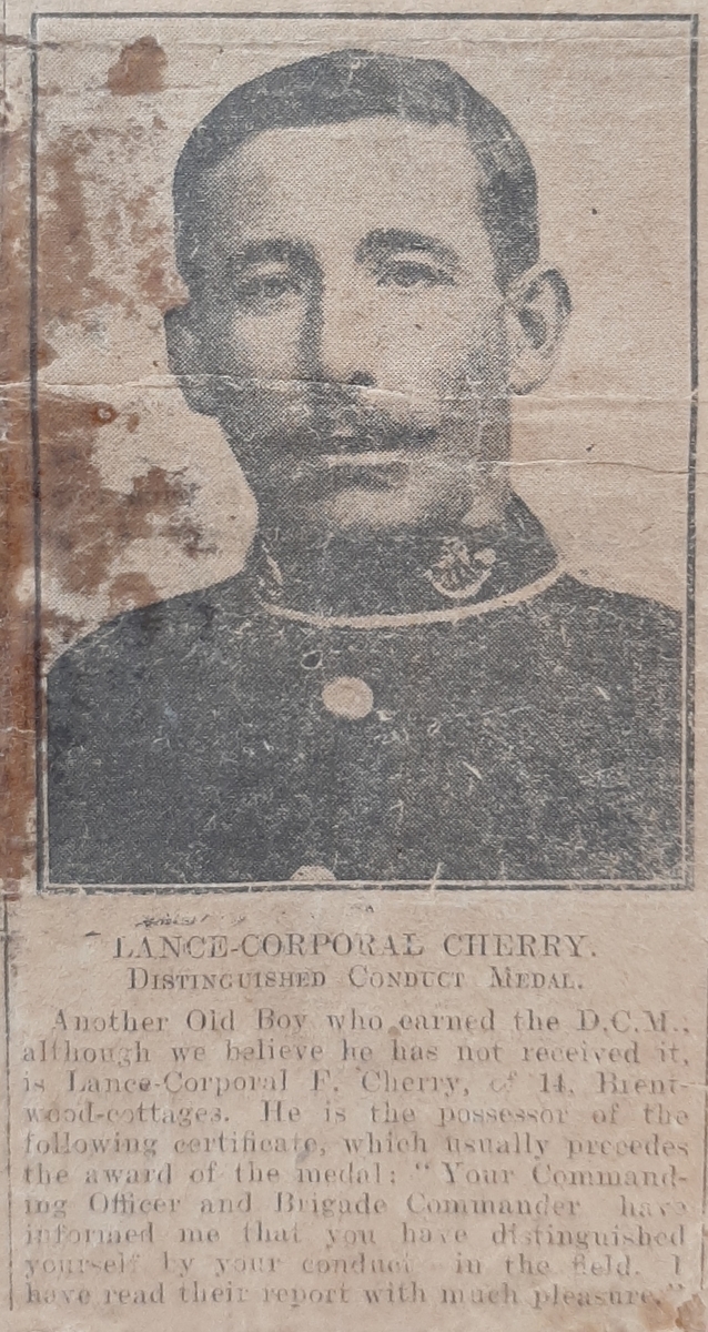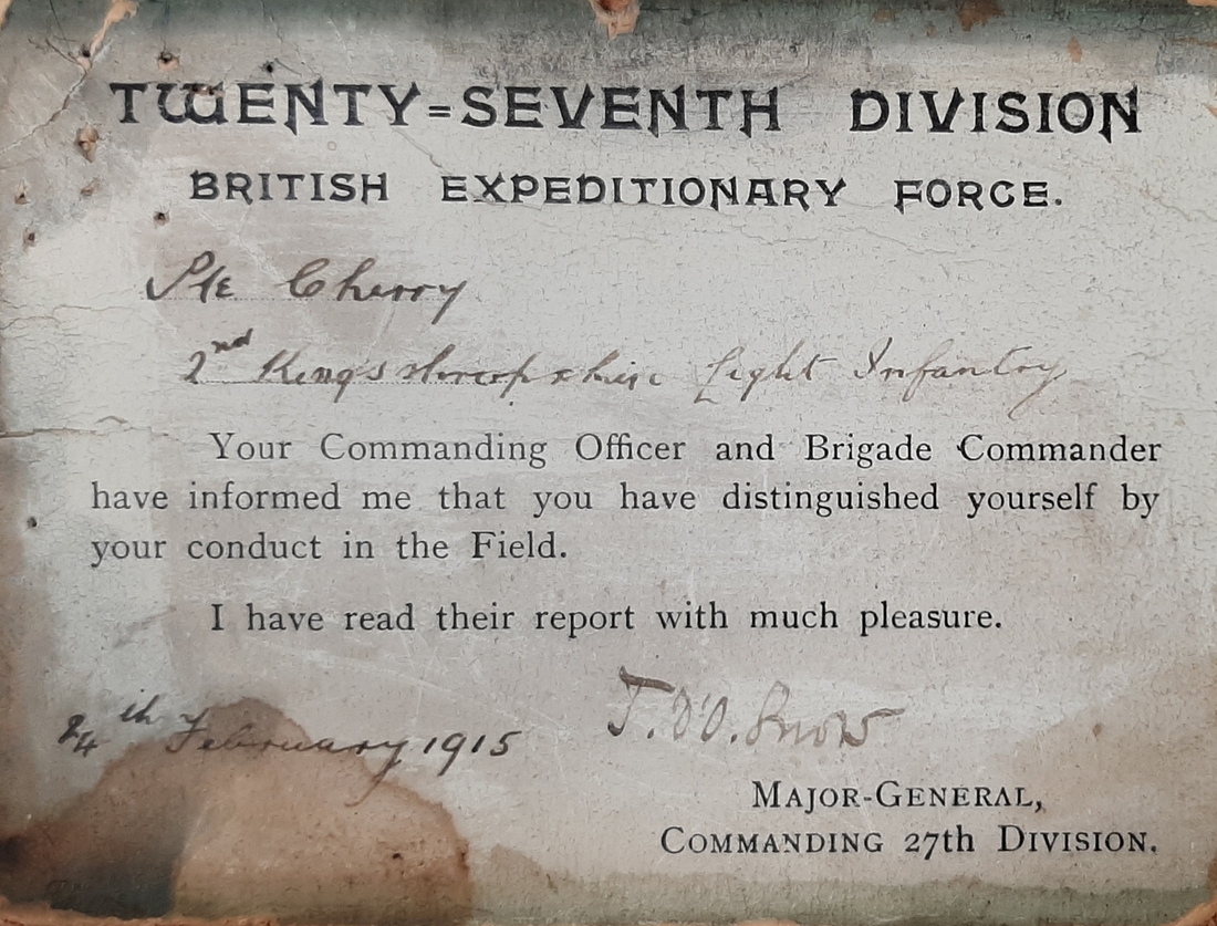 Frederick William Cherry was born at Greenwich on 27 March 1888, the son of Henry Cherry. A postman, he enlisted at Woolwich in the Shropshire Light Infantry on 29 October 1907 and served with them during the Great War before he was wounded by a shell burst receiving injuries to his head, shoulder and leg on 23 June 1915. Earlier he had been awarded a 27th Division commendation card in appreciation of services rendered in the field on 24 February 1915, this accompanies the group. He then transferred to the Labour Corps and was allotted a new number, 266133.