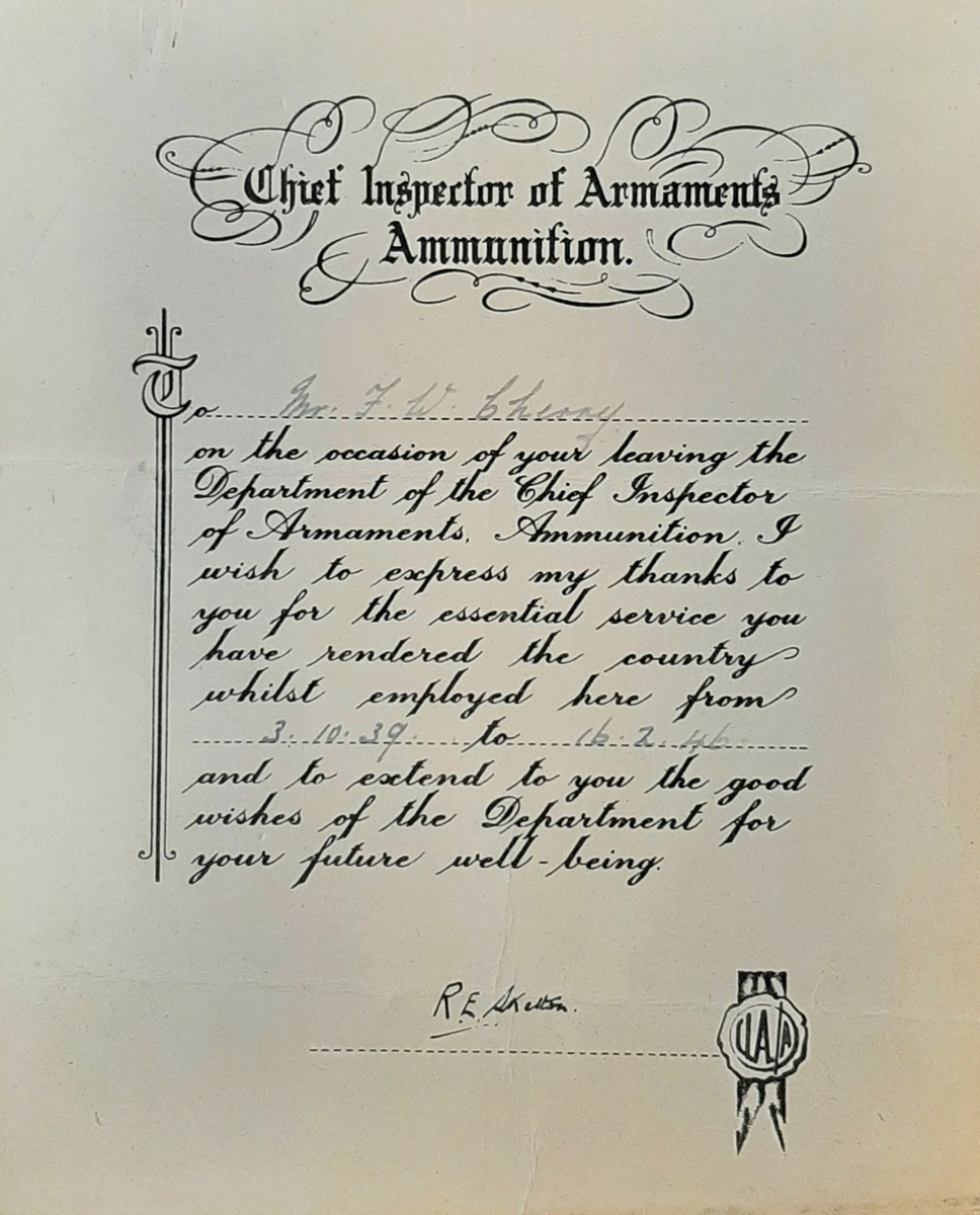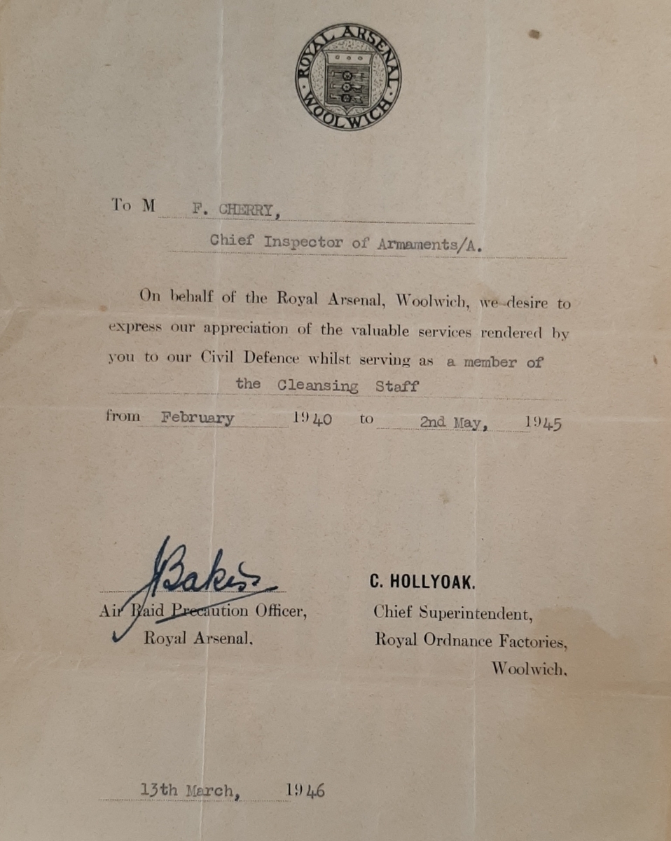 After the war, he was employed at the Royal Military Academy Sandhurst and later at the Royal Arsenal at Woolwich as Chief Inspector of Armaments. Cherry died at Bexleyheath, Kent on 10 June 1963; sold together with award document for the I.S.M., testimonials confirming post war appointments, original marriage certificate, two certificates of service, three pre-war photographs of Cherry, one in uniform, a newspaper cutting from the Eltham newspaper containing a photo of Cherry.