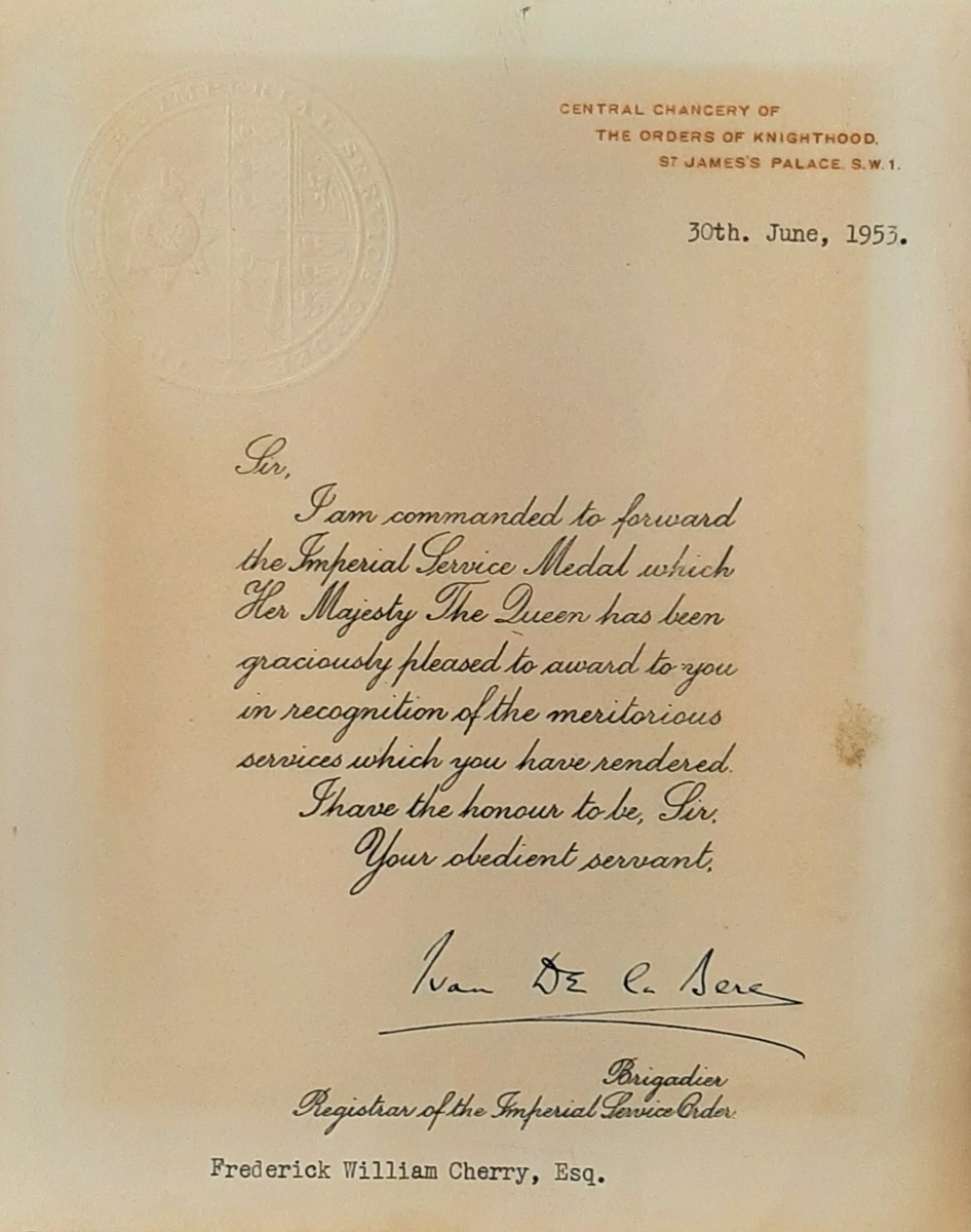 1914-15 Star (8647. Pte. F.W. Cherry. Shrops. L.I.); British War and Victory Medals, with M.I.D. oak leaves (8647 Pte. F.W. Cherry. K.S.L.I.); Imperial Service Medal in Elkington, London, case of issue; G.VI.R.( Frederick William Cherry), very fine (4)