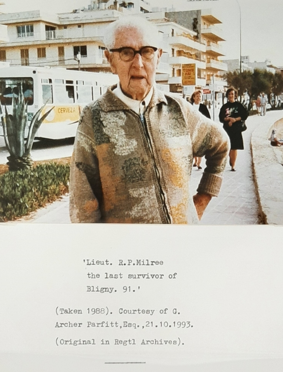 Discharged on 15 April 1921, Milree settled in Bournemouth where he worked as an Optician. He lived for a remarkable length of time, finally dying on 22 January 1990 at the grand age of 93, a photograph in the possession of the Regimental Association states that he was the last survivor of Bligny Hill.