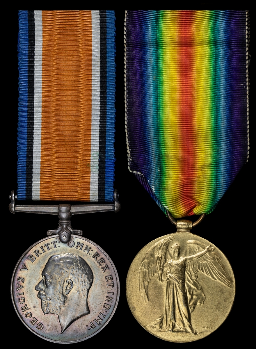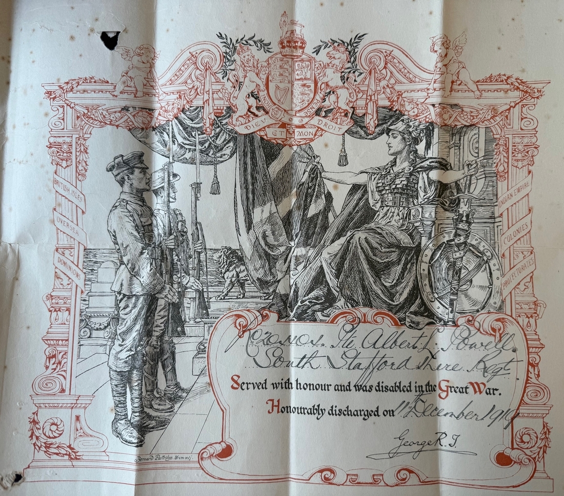 The well-documented and poignant campaign pair awarded to Private A. L. Powell, 2nd Battalion, South Staffordshire Regiment, who was severely wounded to the head and legs at Cambrai on 4 October 1918 - those wounds required the amputation of the left leg at the thigh; the gallant Powell returned to civilian life and had a long career with the National Physical Laboratory at Teddington