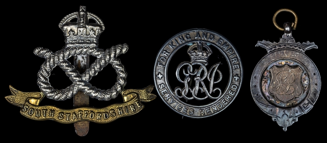 Cap badge and a prize Medal, engraved 'L.P. K.D.S. F.L. Winners 1913', probably 'Leslie Powell. Kingston District Schools. Football League. Winners 1913'.