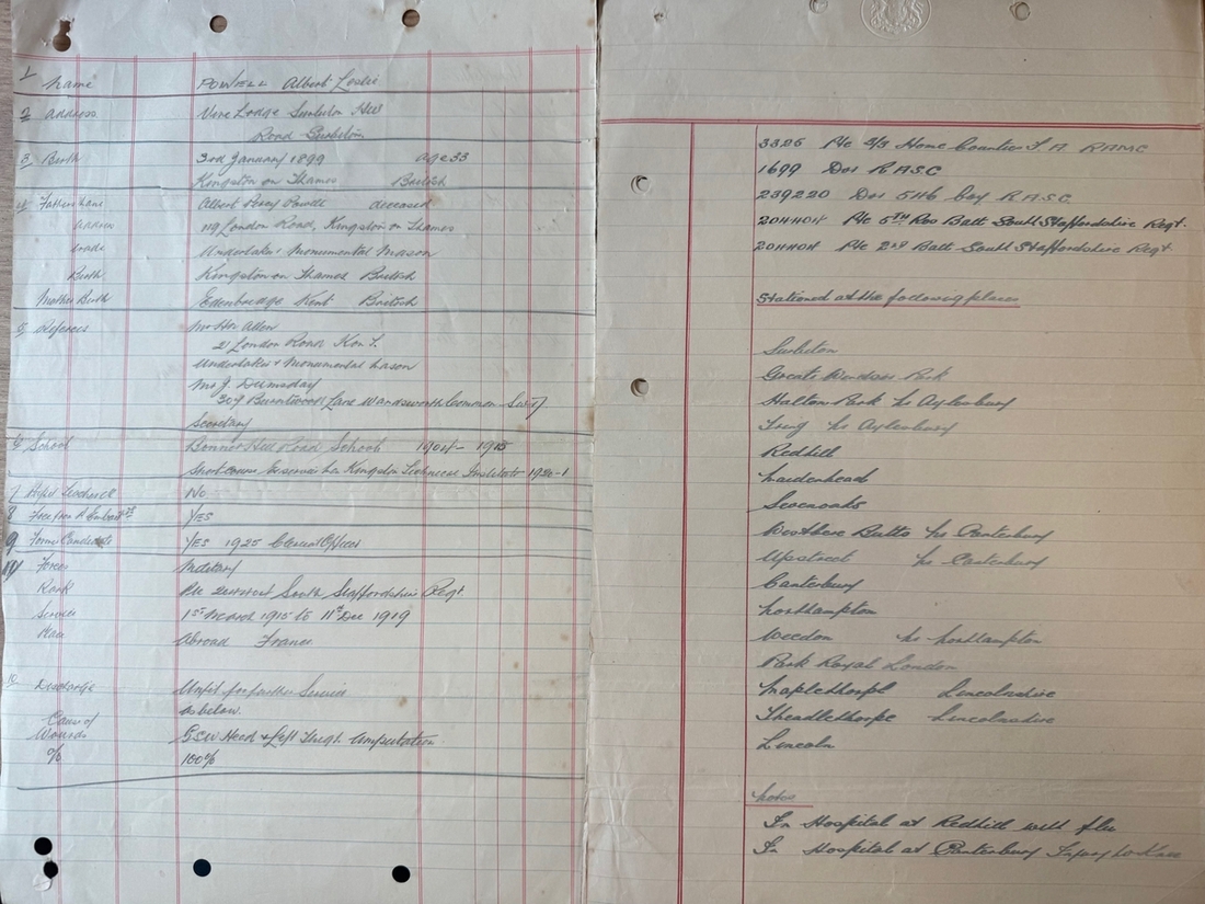 Albert Leslie Powell was born at Kingston, Surrey on 3 January 1899 and was educated at Bonner Hill Road Council School, Kingston. With the outbreak of the Great War, he enlisted underage - stating his birth being in 1896 - into the 3/3rd Home Counties Field Ambulance, Royal Army Medical Corps (No. 3325). Having joined the 2nd Battalion, South Staffordshire Regiment, Powell served overseas and suffered his grave wounds at Cambrai on 4 October 1918.