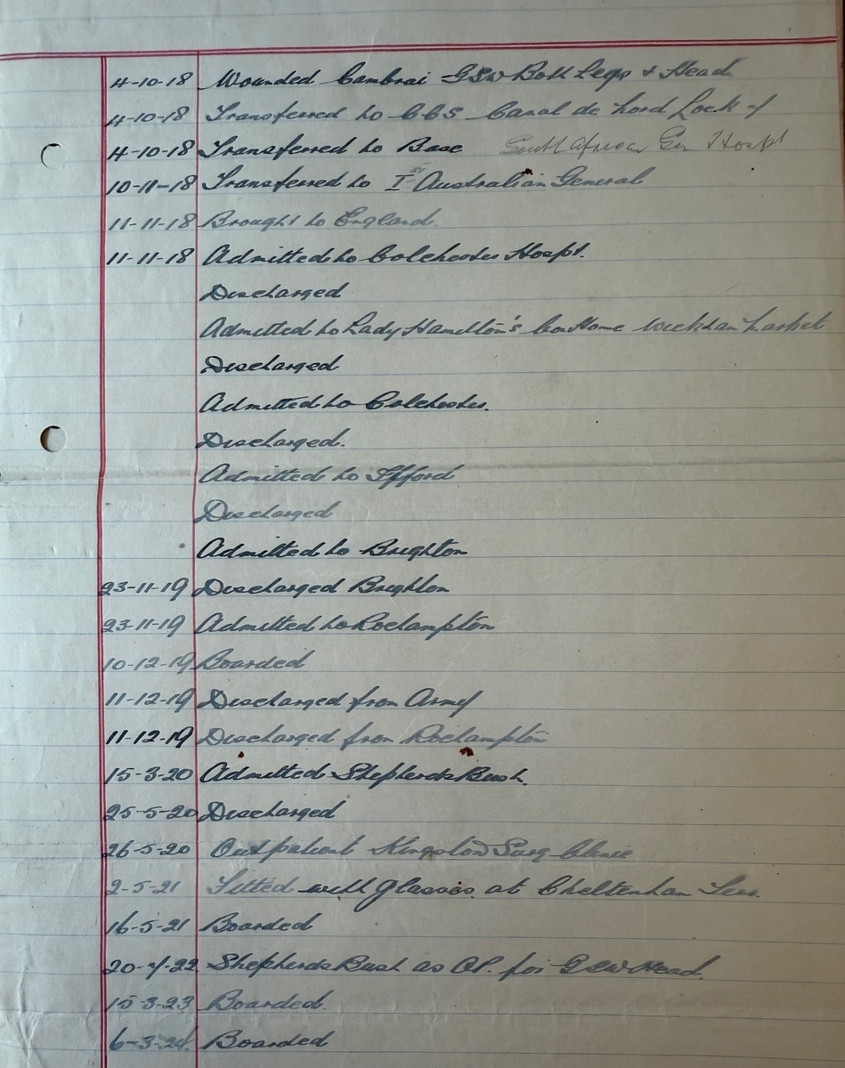 Hand written resume of life events, full details of wounds and medical treatment subsequently. He was wounded at Cambrai on 4 October 1918 with a gunshot wound to both legs and head.