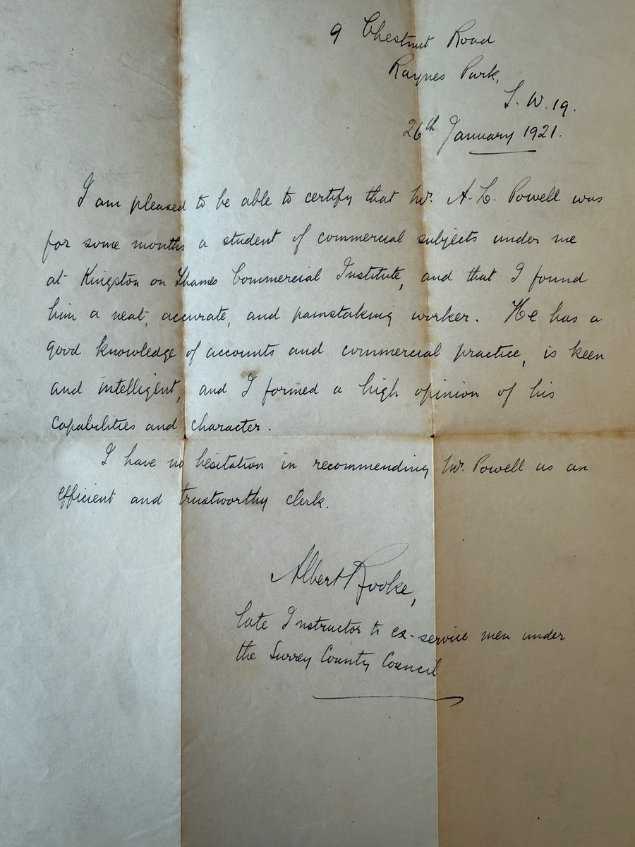Powell got himself enrolled on an ex-services course at Kingston Technical Institute in 1920-21 and found work at the National Physical Laboratory at Teddington. By June 1934 he would be promoted Grade II Class Clerk in the Accounts Branch and was still working there by 1939. Powell died on 30 January 1961.