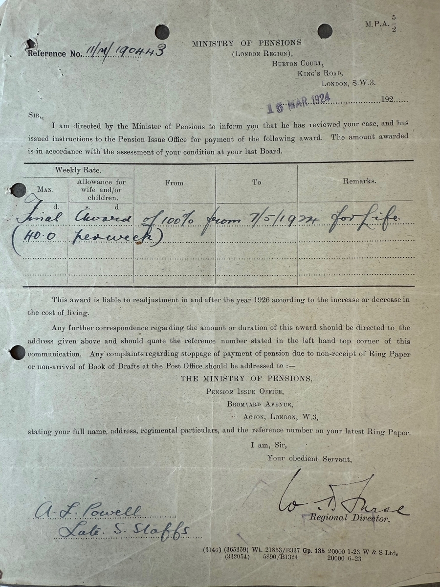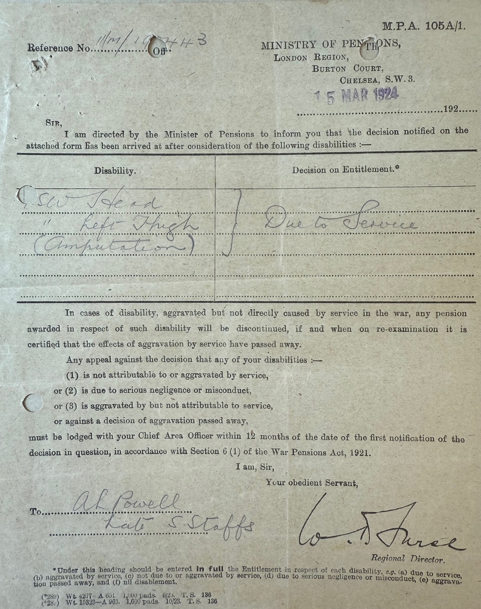 Letters from the Ministry of Pensions relating to a Severe Wound to the Head and Severe Wound to his Left Thigh (Amputation); Final Award of Pension of 40 Shillings a week, both letters dated 15 March 1924.