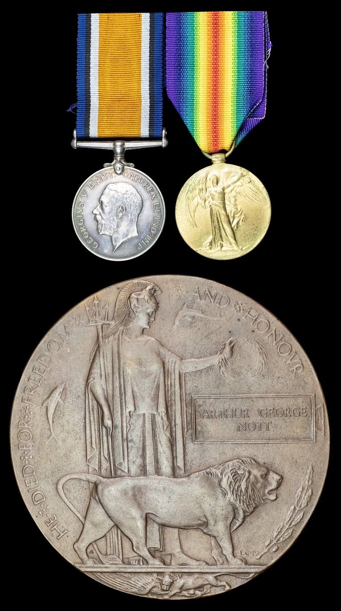 A Great War Casualty Pair awarded to Private A. G. Nott, Worcestershire Regiment, who was Killed in Action on 5 November 1916
