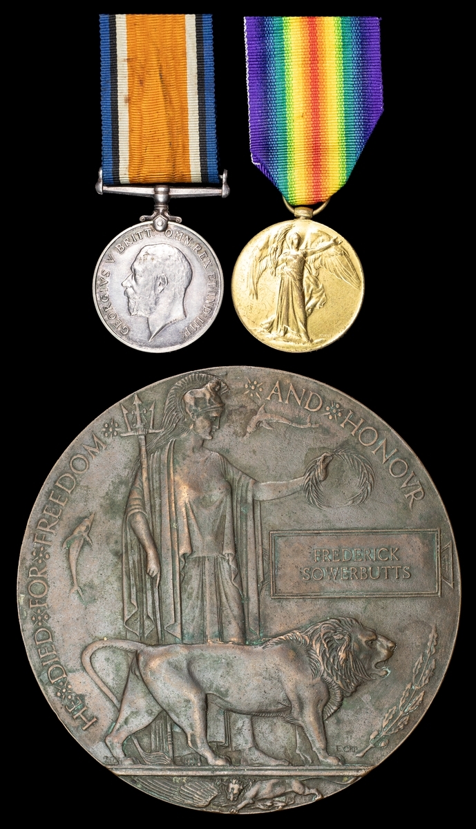 British War and Victory Medals (7713 Pte. F. Sowerbutts. 9-Lond.R.); Great War Bronze Memorial Plaque (Frederick Sowerbutts), the pair extremely fine, the plaque lightly polished in the past and with verdigris stains (3)