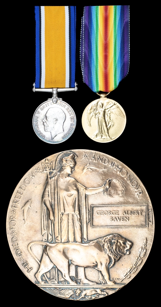British War and Victory Medals (145638 Gnr. G. A. Raven. R.A.); Great War Bronze Memorial Plaque (George Albert Raven), the pair extremely fine whilst the plaque has been polished (3)