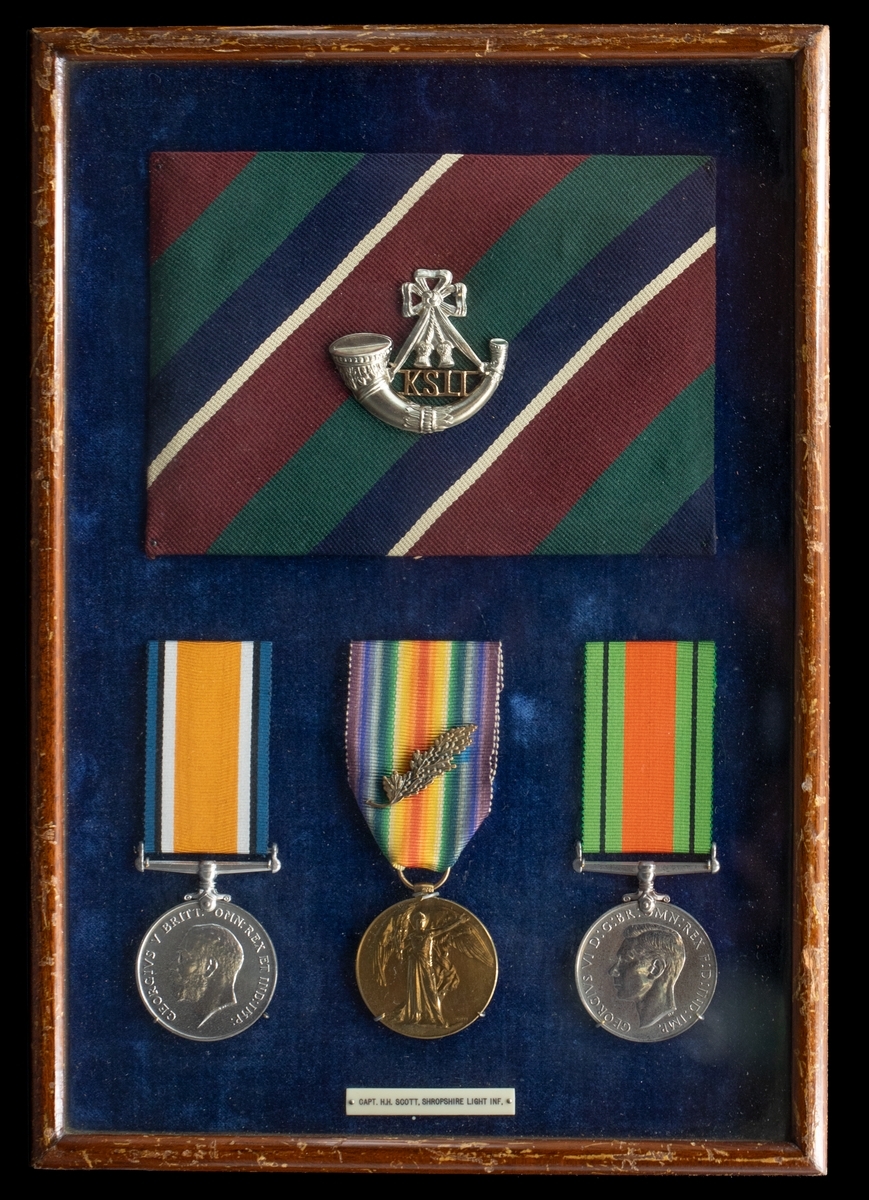British War and Victory Medals (Capt. H. H. Scott.), with M.I.D. oak leaves; Defence Medal 1939-45, mounted in an attractive wooden frame by Spink & Son with an Officer's Service Dress cap badge and a section of a Regimental Scarf, good very fine (3)