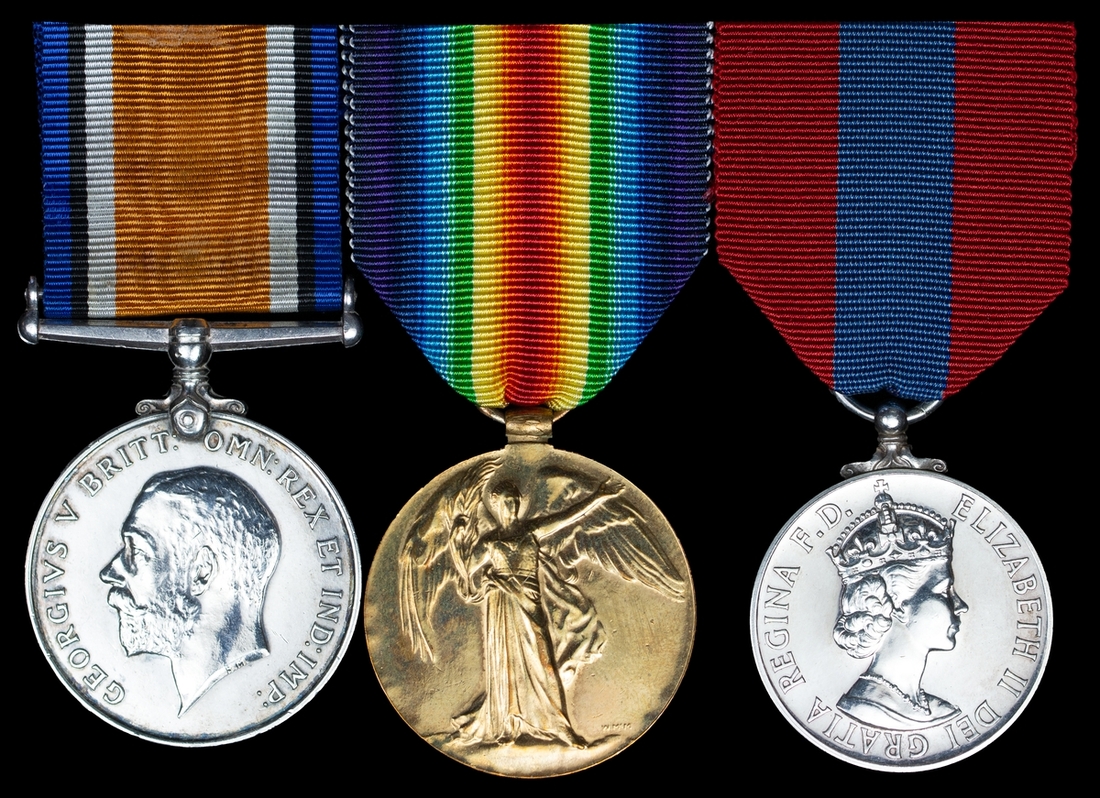 Frank Stephens was born at Stoke, Devonport, Devon on 17 December 1896, and was previously a tailor's cutter before he enlisted into the Plymouth Division of the Royal Marines Light Infantry on 20 November 1915. He served at the Recruit Depot at Deal from 20 November 1915 - 2 February 1916 and then served with the Plymouth Division from 3 February 1916 - 27 June 1916 before serving with Victory (R.M.Brigade) from 28 June 1916 - 31 December 1917. During this time, he served with the British Expeditionary Force in France from 26 September 1916 - 8 April 1917, before returning again serving between 5 February 1918 -28 March 1918. He was taken Prisoner of War on 29 March 1918 and was released on 30 November 1918. Stephens then returned to the Plymouth Division from 30 January 1919 - 18 April 1919 when he was demobilised. He remained in Devon and was noted as being an Admiralty Storehouseman in the 1939 Register living with his wife Lilian. He was awarded his Imperial Service Medal in November 1958 still serving as a Storehouseman at Devonport.