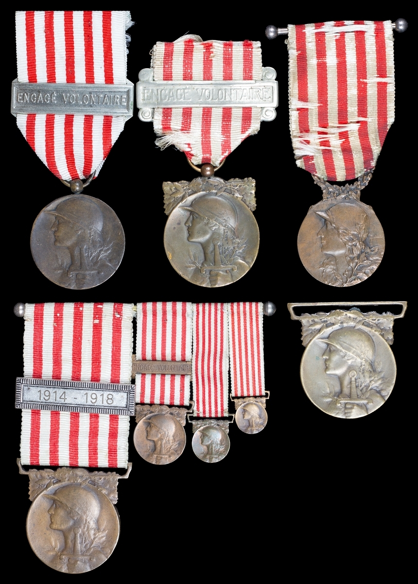 (x) France, Republic, Commemorative Medal 1914-18 (5), no clasp (2), one unofficial type marked 'Charles'; 1 clasp, Engage Volontaire (2); 1 clasp, 1914-1918; together with three miniature medals, one with Engage Volontaire clasp, some polished, about very fine and mostly very fine (5)
