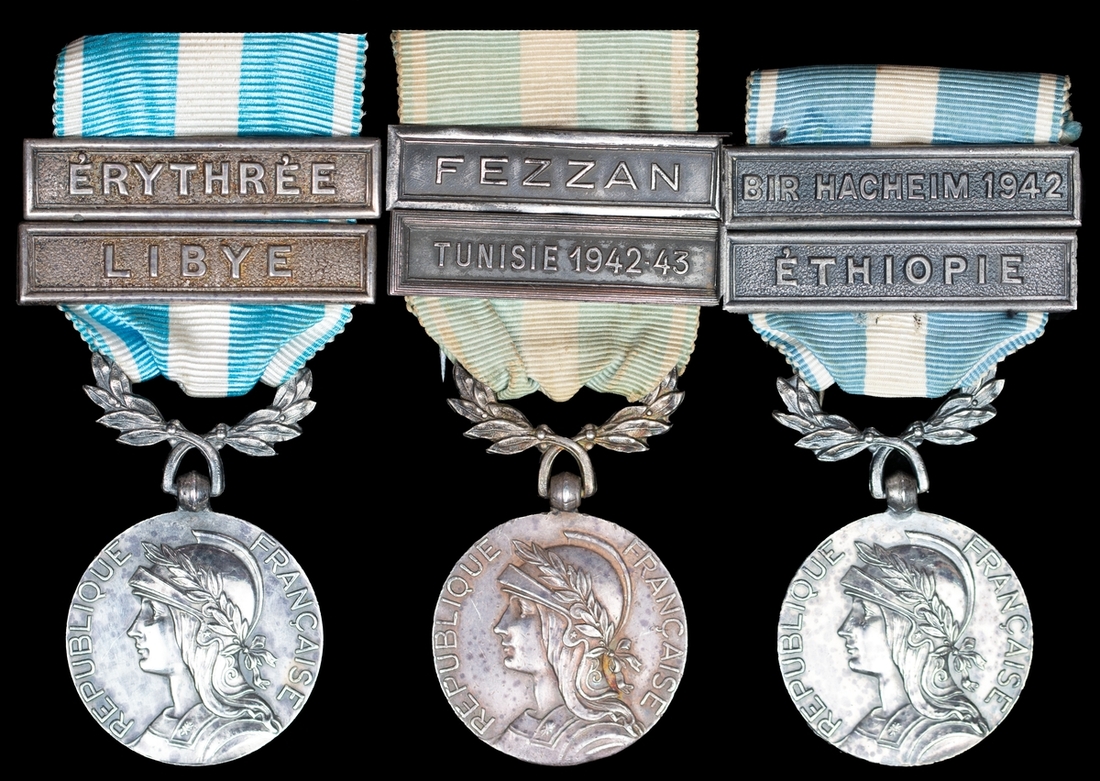 (x) France, Republic, Colonial Medal, 2 clasps (3), Ethiopie, Bir Hacheim 1942; Libye, Erythree; Tunisie 1942-43, Fezzan, one with some edge wear, otherwise generally very fine (3)