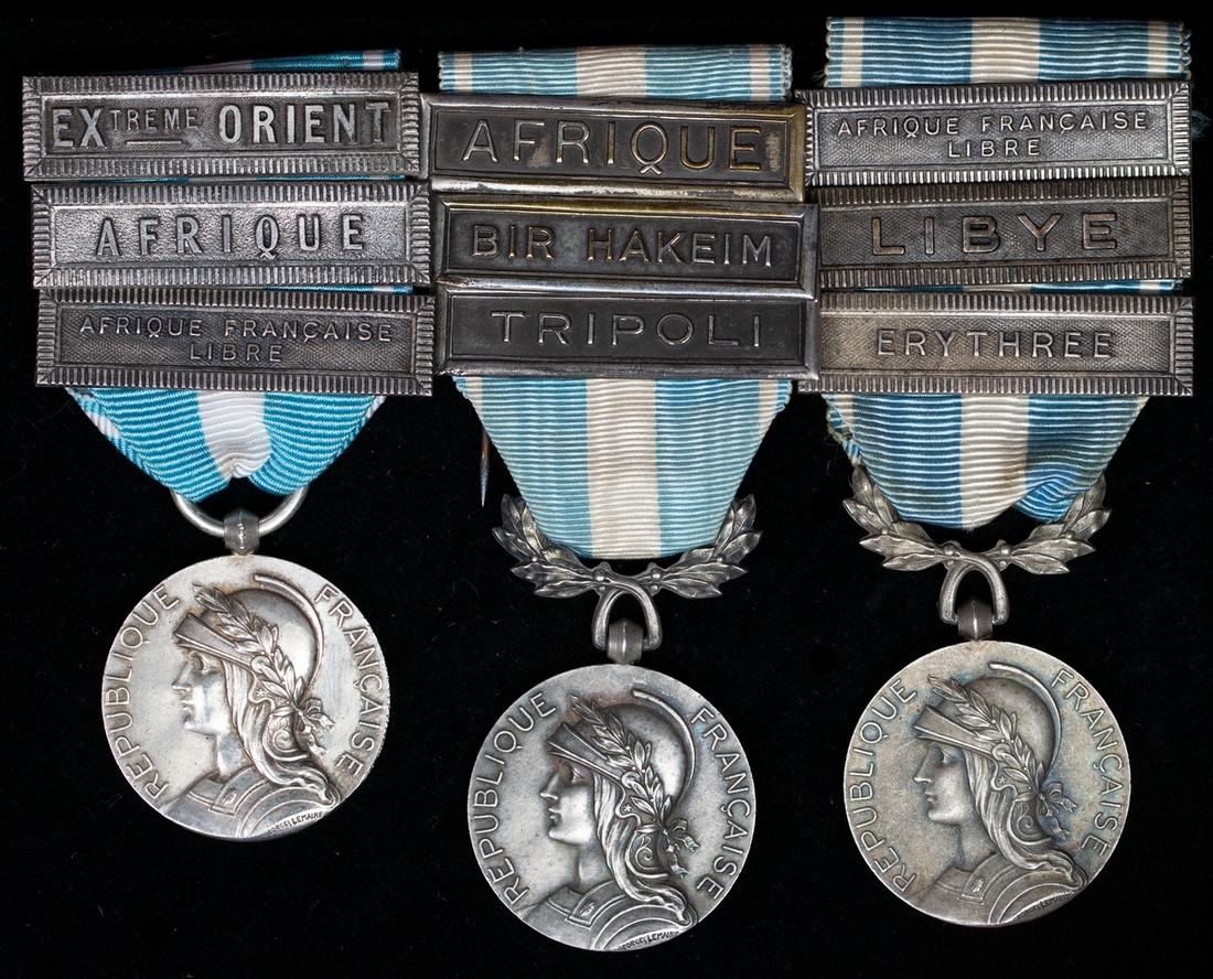(x) France, Republic, Colonial Medal, 3 clasps (3), Afrique Francaise Libre, Afrique, Extreme Orient; Erythree, Libye, Afrique Francaise Libre; Tripoli, Bir Hakeim, Afrique, all stamped 'Georges Lemaire', light contact wear and some scratches, otherwise overall very fine (3)