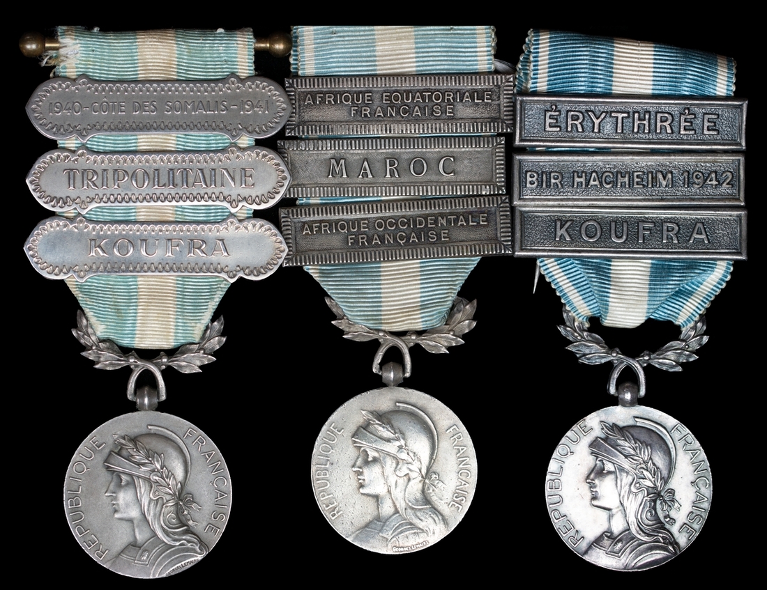 (x) France, Republic, Colonial Medal, 3 clasps (3), Afrique Occidentale Francaise, Maroc, Afrique Equatoriale Francaise, stamped 'Georges Lemaire', with silver marks; Koufra, Bir Hacheim 1942, Erythree; Koufra, Tripolitaine, 1940-Cote des Somalis-1941, oriental type clasps, stamped 'Georges Lemaire', the first two with contact wear, about very fine to very fine, the last good very fine (3)