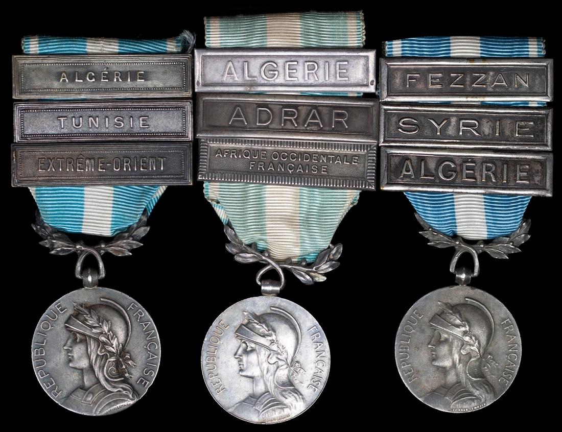 (x) France, Republic, Colonial Medal, 3 clasps (3), Afrique Occidentale Francaise, Adrar, Algerie, marked silver; Algerie, Syrie, Fezzan, marked silver; Extreme Orient, Tunisie, Algerie, all stamped 'Georges Lemaire', some with contact wear, about very fine to very fine (3)