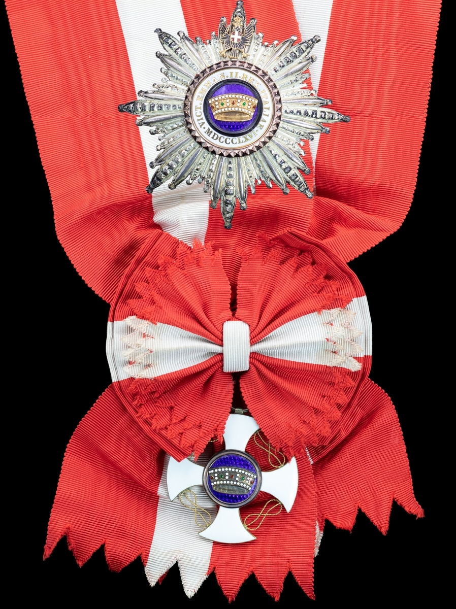 (x) Italy, Kingdom, Order of the Crown, Knight Grand Cross set of Insignia, by E. Gardino Succ. Cravanzola, Roma, comprising sash badge, 49mm, gold and enamel, on full sash riband as worn; breast Star, 89mm, silver, gold and enamel, maker's cartouche to reverse, toned, otherwise good very fine (2)
