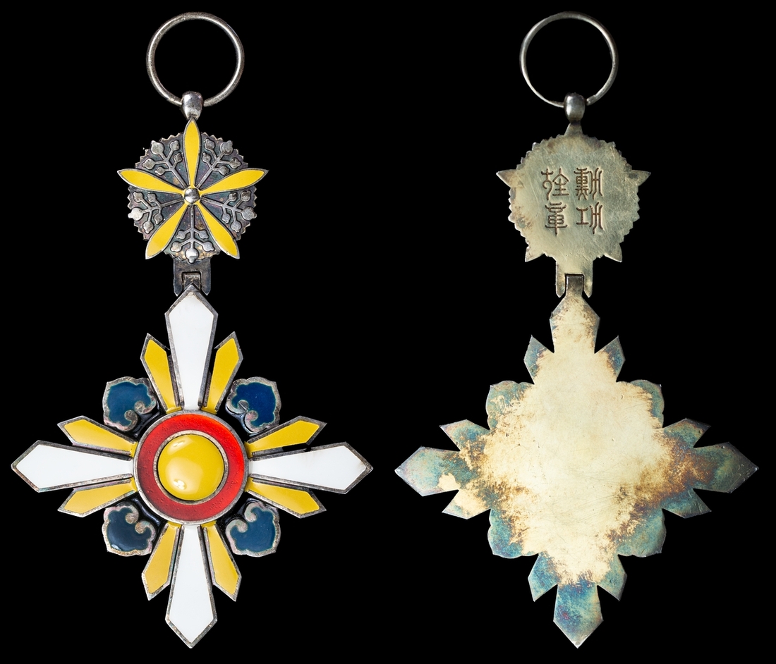 (x) Japan, Manchukuo, Order of the Auspicious Clouds Badge, 102mm including suspension x 70mm, silver and enamel, Japanese characters on reverse of suspension translate to 'Order of Merit Decorations', minor enamel chips to two white ray tips, otherwise very fine