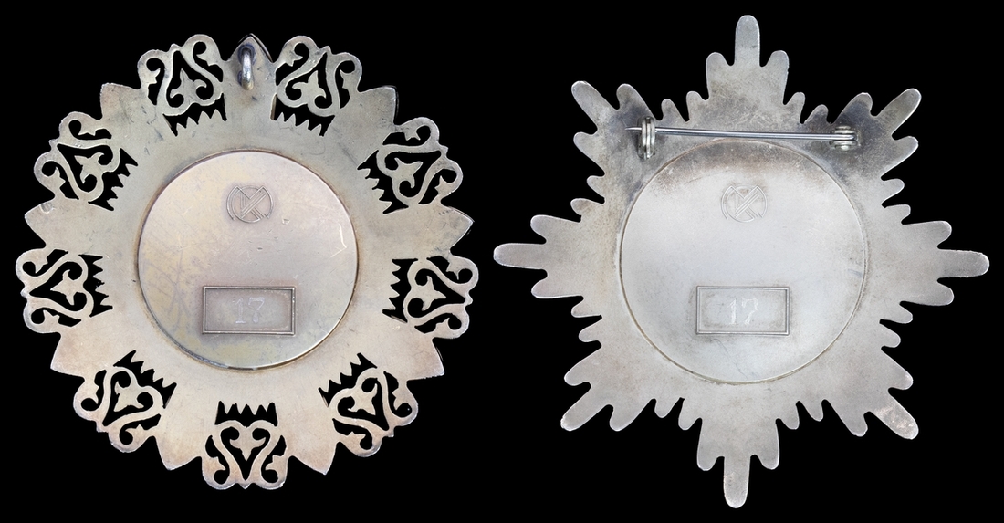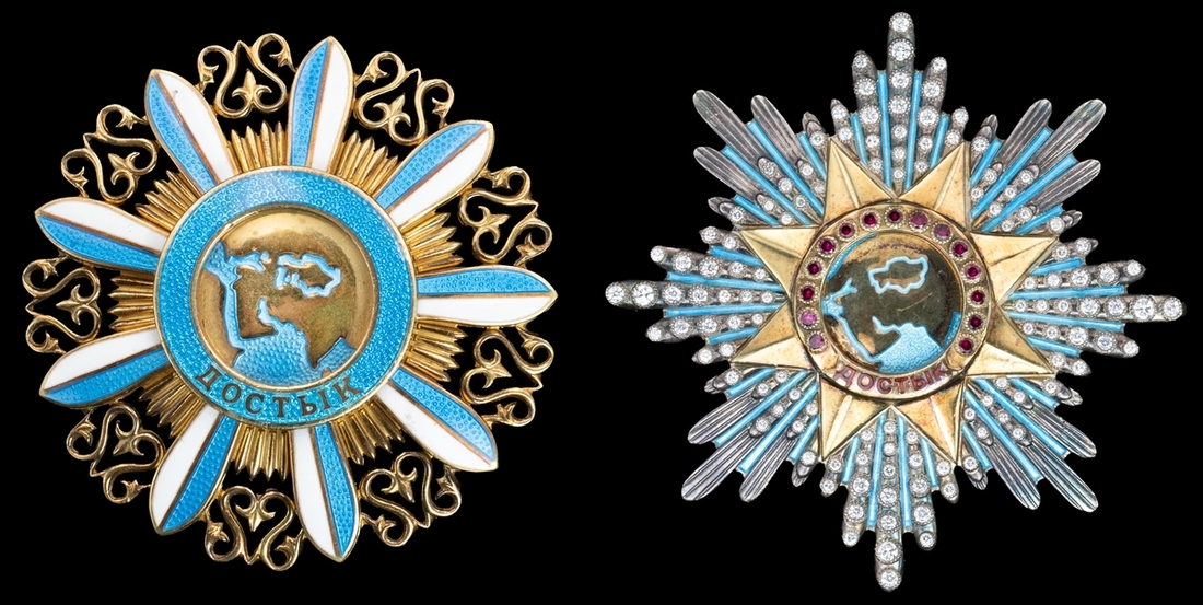 Kazakhstan, Republic, Order of Dostyk (Friendship), 1st Class set of Insignia, comprising sash Badge, 62mm, silver-gilt and enamel, reverse officially numbered '17'; breast Star, 67mm, silver, silver-gilt and enamel, enhanced with a plethora of paste 'diamonds' and 'rubies', reverse officially numbered '17', good very fine, with fitted pad from case of issue and award booklet for No. 17 issued in December 2001, this missing several pages (2)